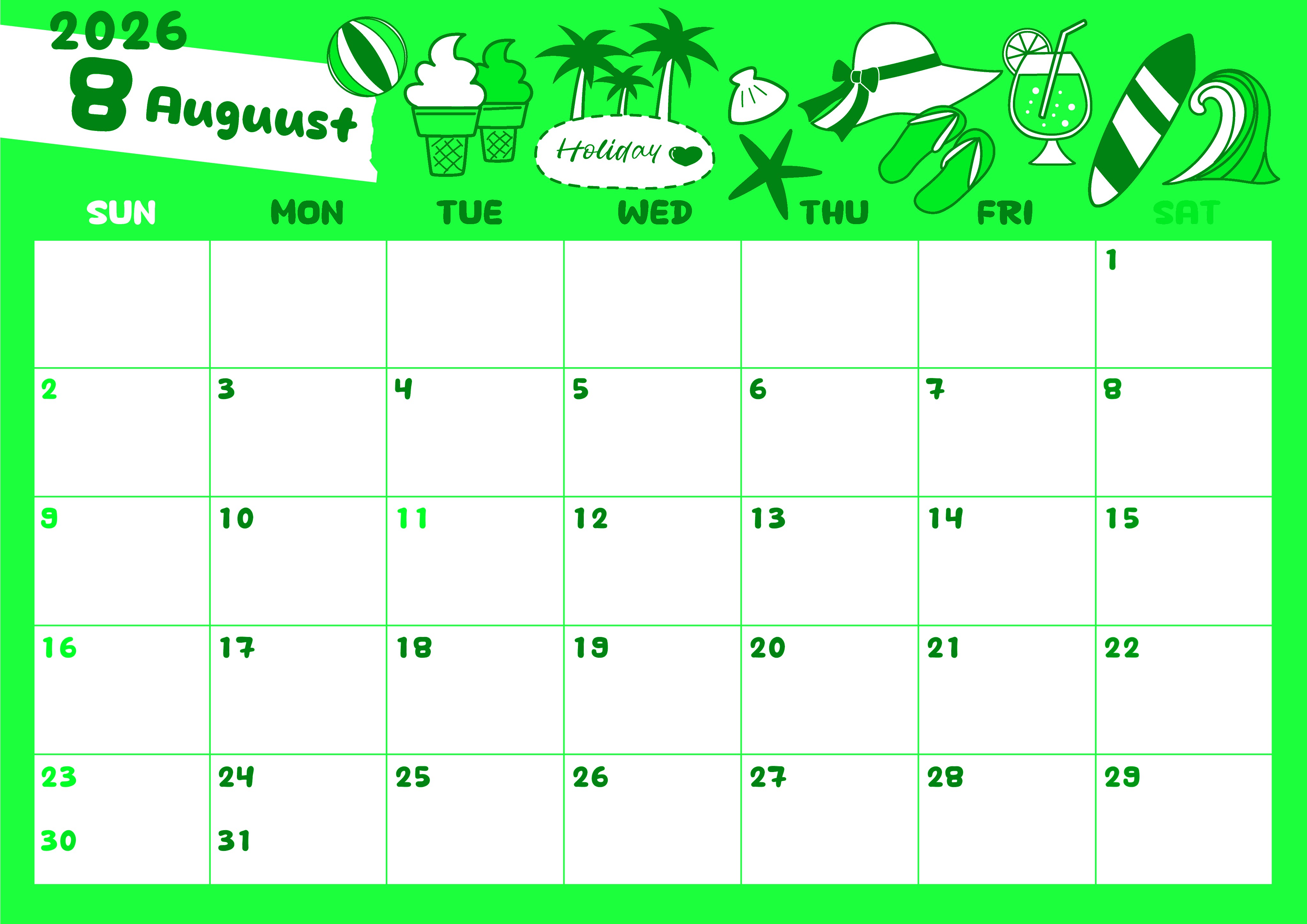 2026年8月横型日曜始まりの無料テンプレートグリーンのカレンダーです。夏休みに海岸で日向ぼっこをしたり海水浴をしたりしたくなるようなポップで元気いっぱいのかわいいイラストグリーンのカレンダーとなっています。(2026-00940800)
