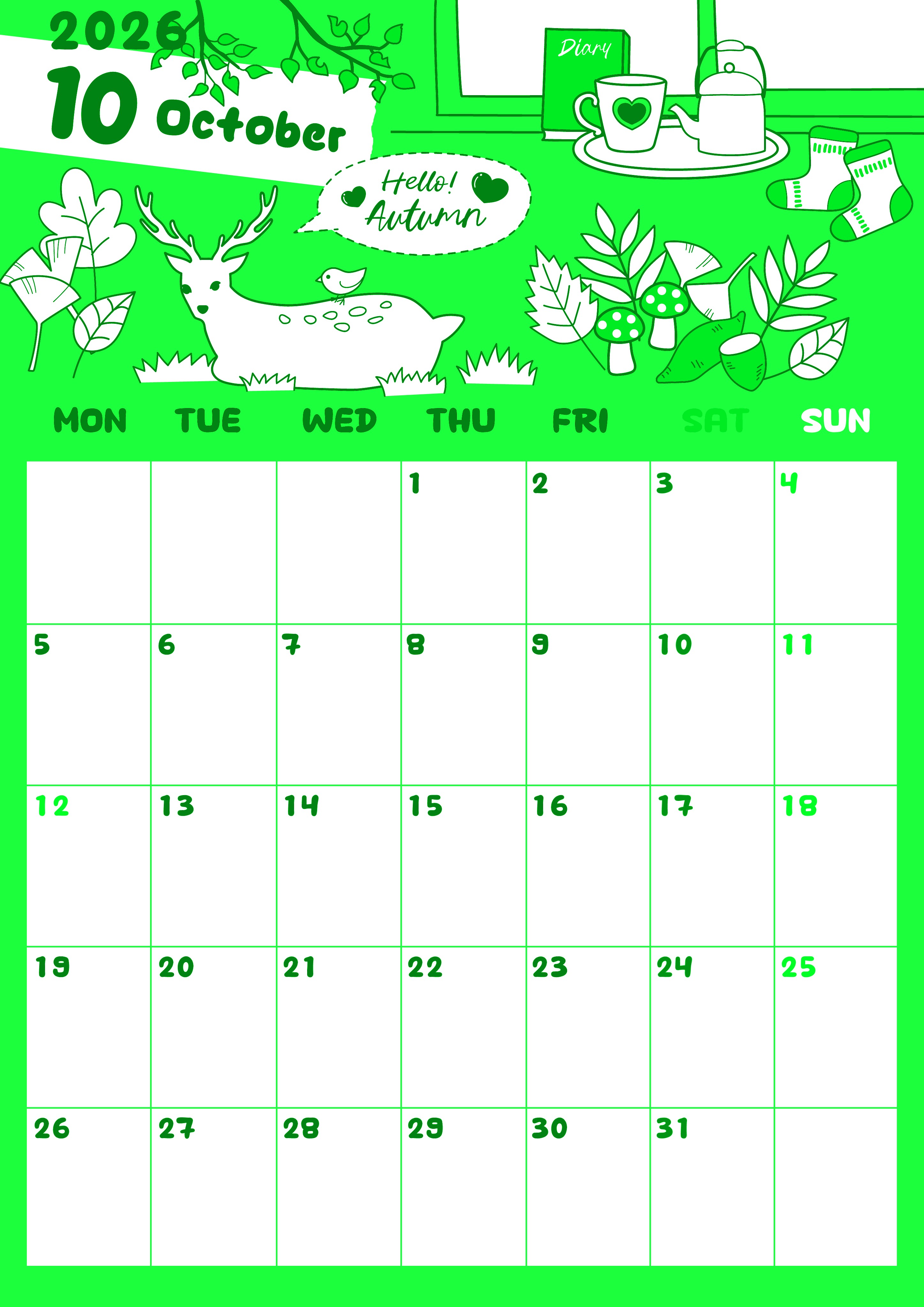 2026年・無料のカレンダーテンプレート 2026年10月縦型月曜始まり 鹿のイラストがかわいいA4無料グリーンのカレンダー(2026-00941011) 素材状デザイン王 2025年4月5日 2026年10月縦型月曜始まりの無料テンプレートグリーンのカレンダーです。鹿がカフェや紅葉の横に配置されていておしゃれな秋の過ごし方を彷彿とさせるかわいいイラストに仕上げました。金運もアップ!(2026-00941011) 10月 縦型のカレンダー 月曜始まり グリーン カレンダーデザイン-0094