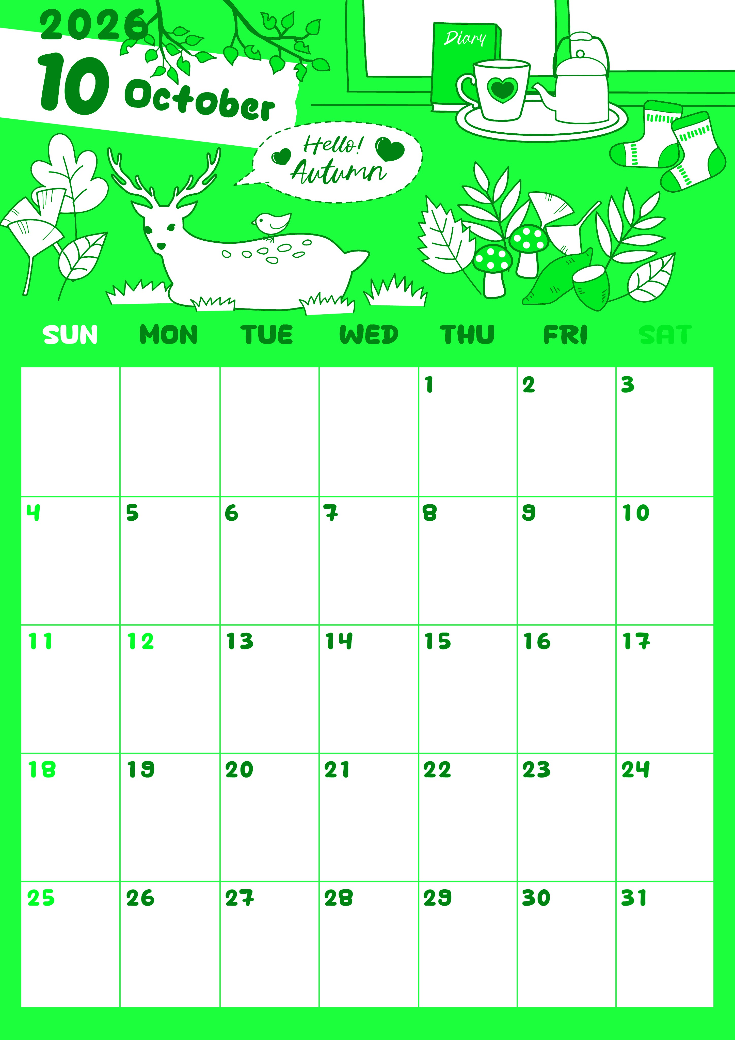 2026年10月縦型日曜始まりの無料テンプレートグリーンのカレンダーです。鹿ののんびりしている様子に癒されるかわいいイラストです。忙しい10月のスケジュールを整理整頓するのに向いている見やすいレイアウトです。(2026-00941010)