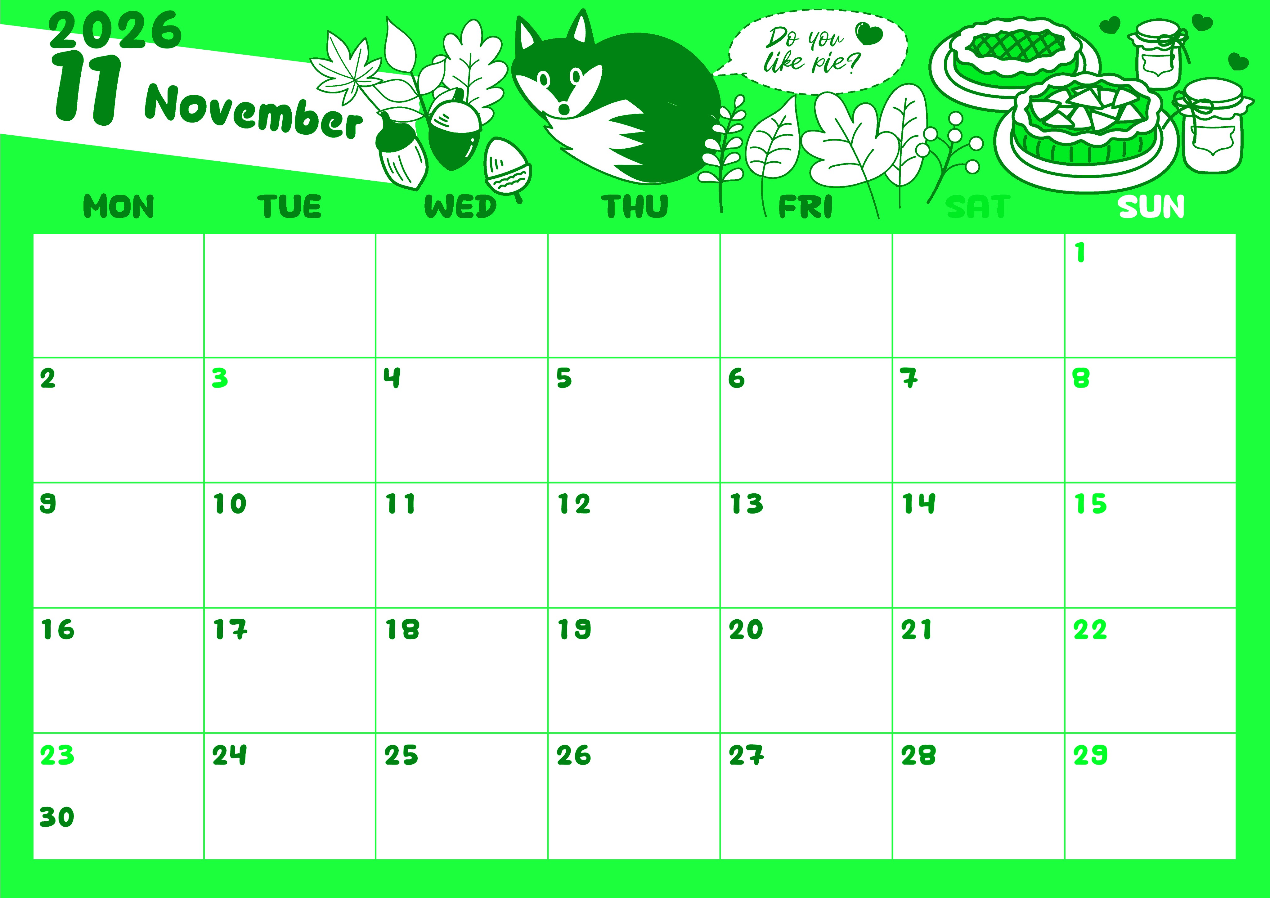 2026年11月横型月曜始まりの無料テンプレートグリーンのカレンダーです。食欲の秋に食べたくなるようなアップルパイのイラストが右上に施されていて全体的に使っているので金運にも良いデザインとなっています。(2026-00941101)
