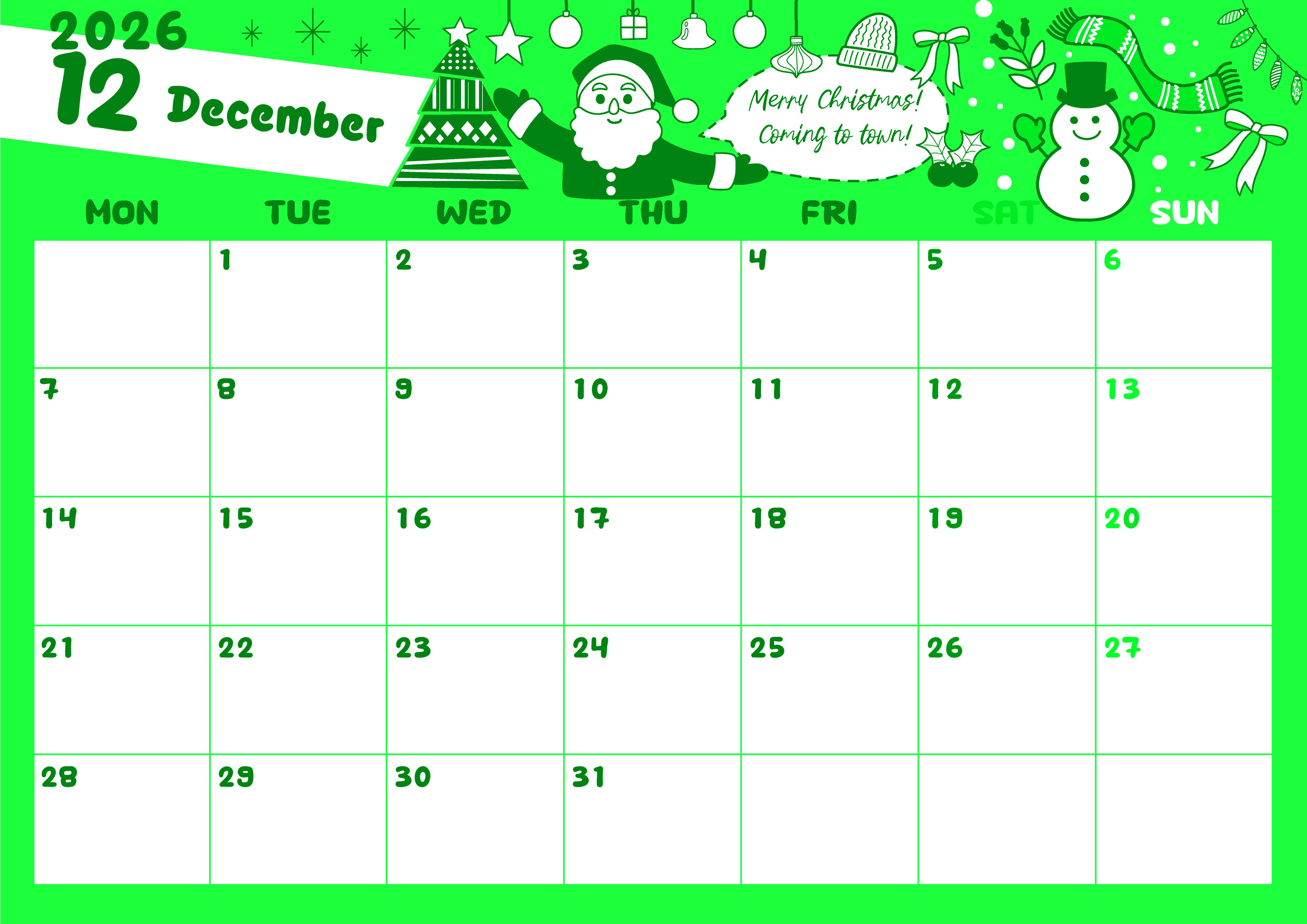 2026年12月横型月曜始まり サンタのイラストがかわいいA4無料グリーンのカレンダー(2026-00941201)