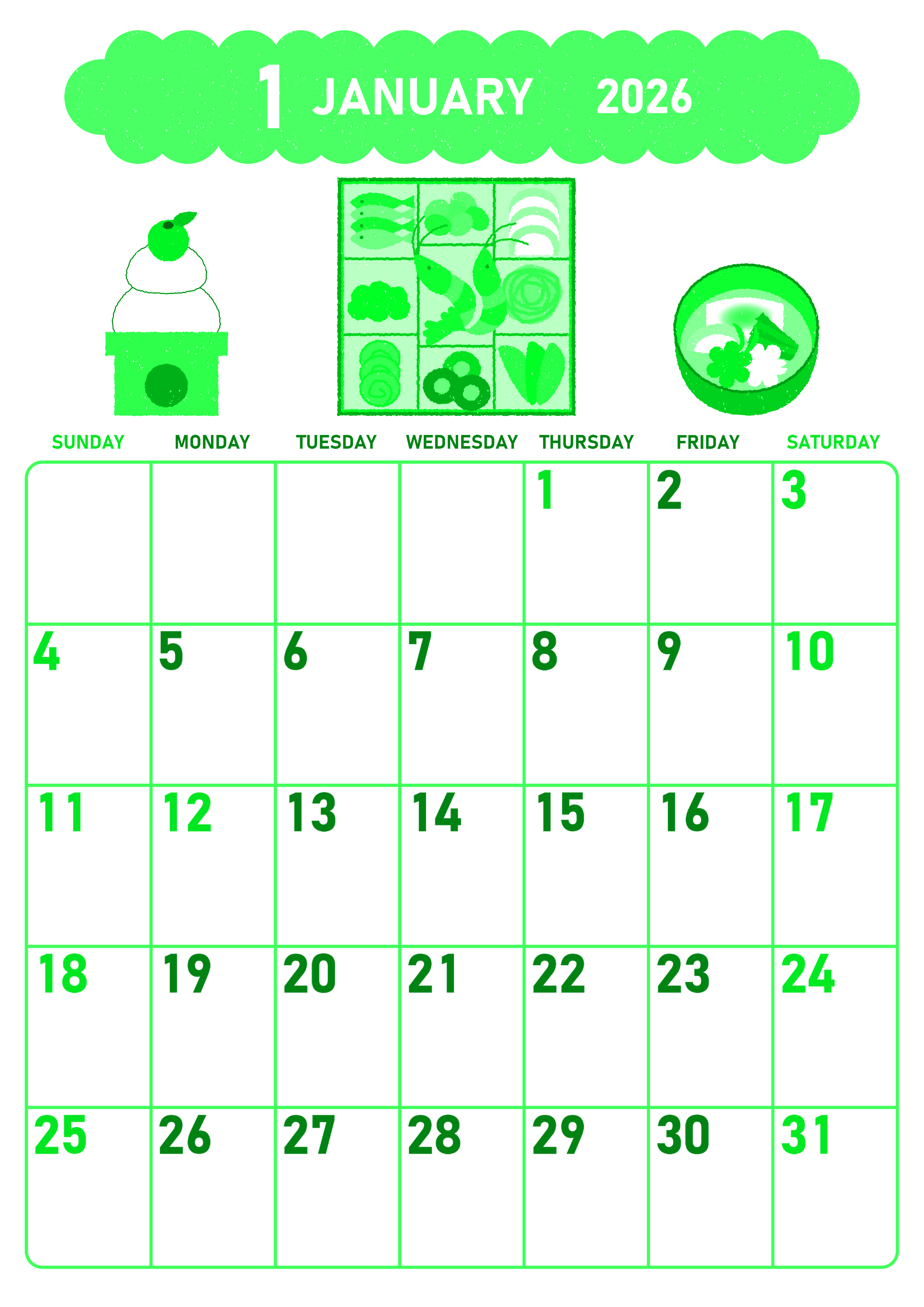 2026年1月縦型日曜始まりグリーンのカレンダーです。1月January2026年を乗せた雲が左上に配置されていてグリーンのカレンダーとして見やすいフォーマットとなっています。お節や鏡餅やお雑煮のイラストだけでなく曜日が色分けされているのもおすすめポイントな無料グリーンのカレンダーです。(2026-00950110)