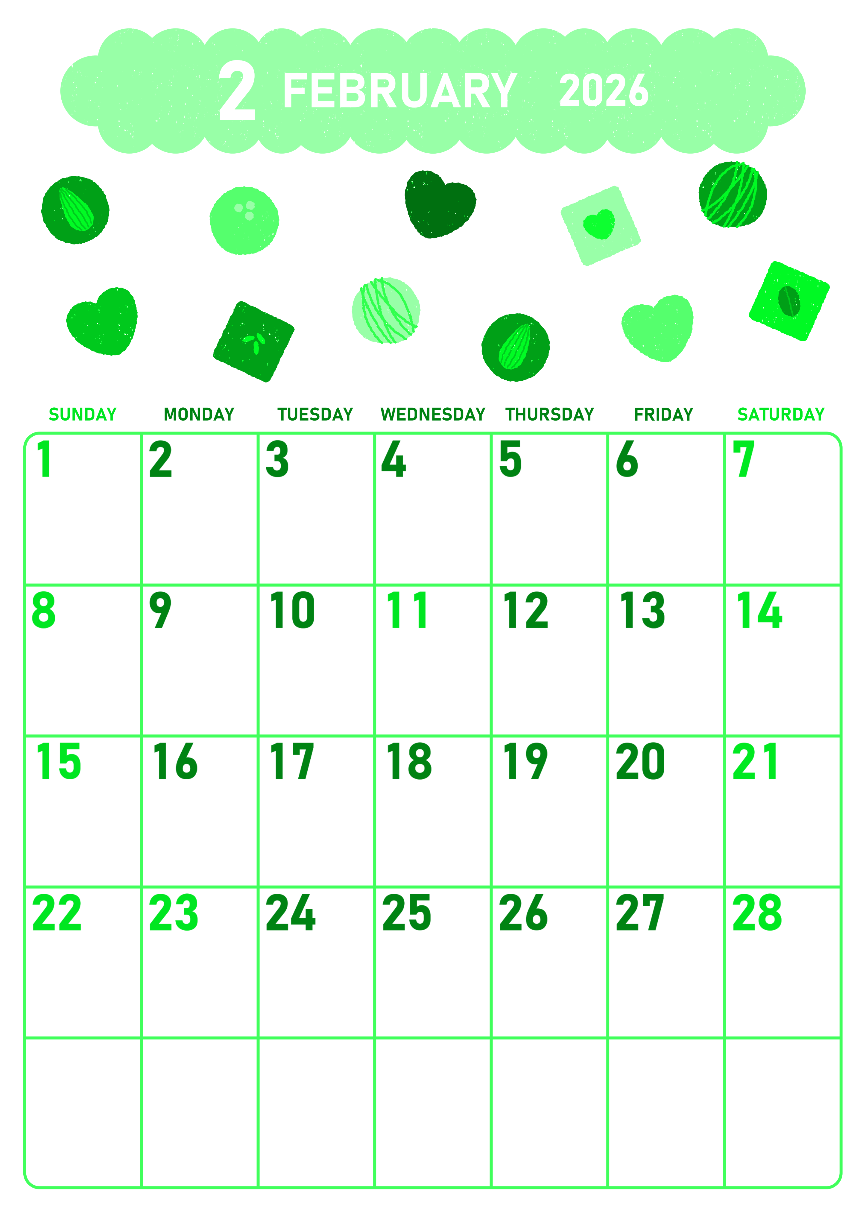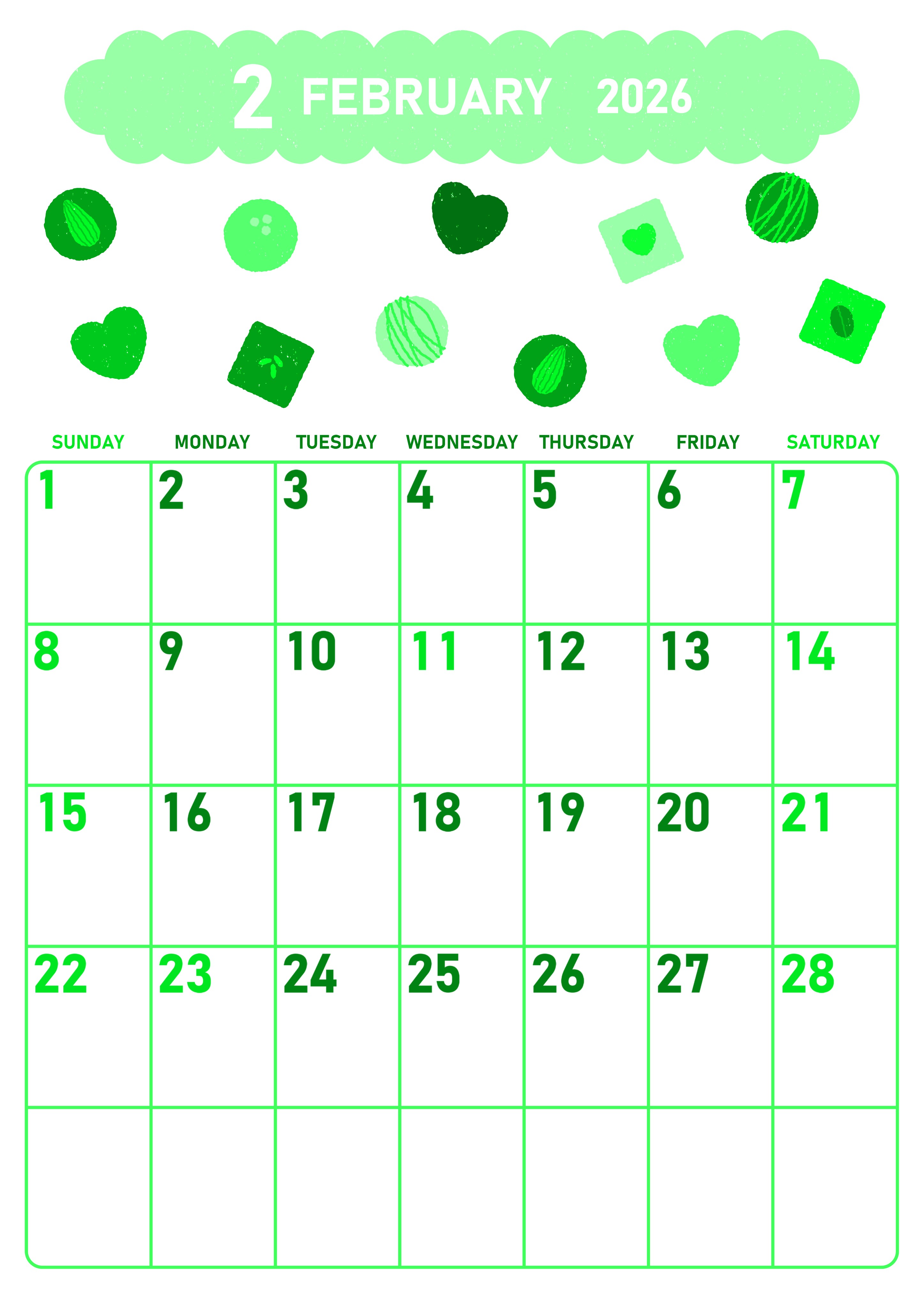 2026年2月縦型日曜始まりグリーンのカレンダーです。色々なチョコレートの粒が甘くてかわいいイラストが乙女心をくすぐるグリーンのカレンダーフリー素材です。(2026-00950210)