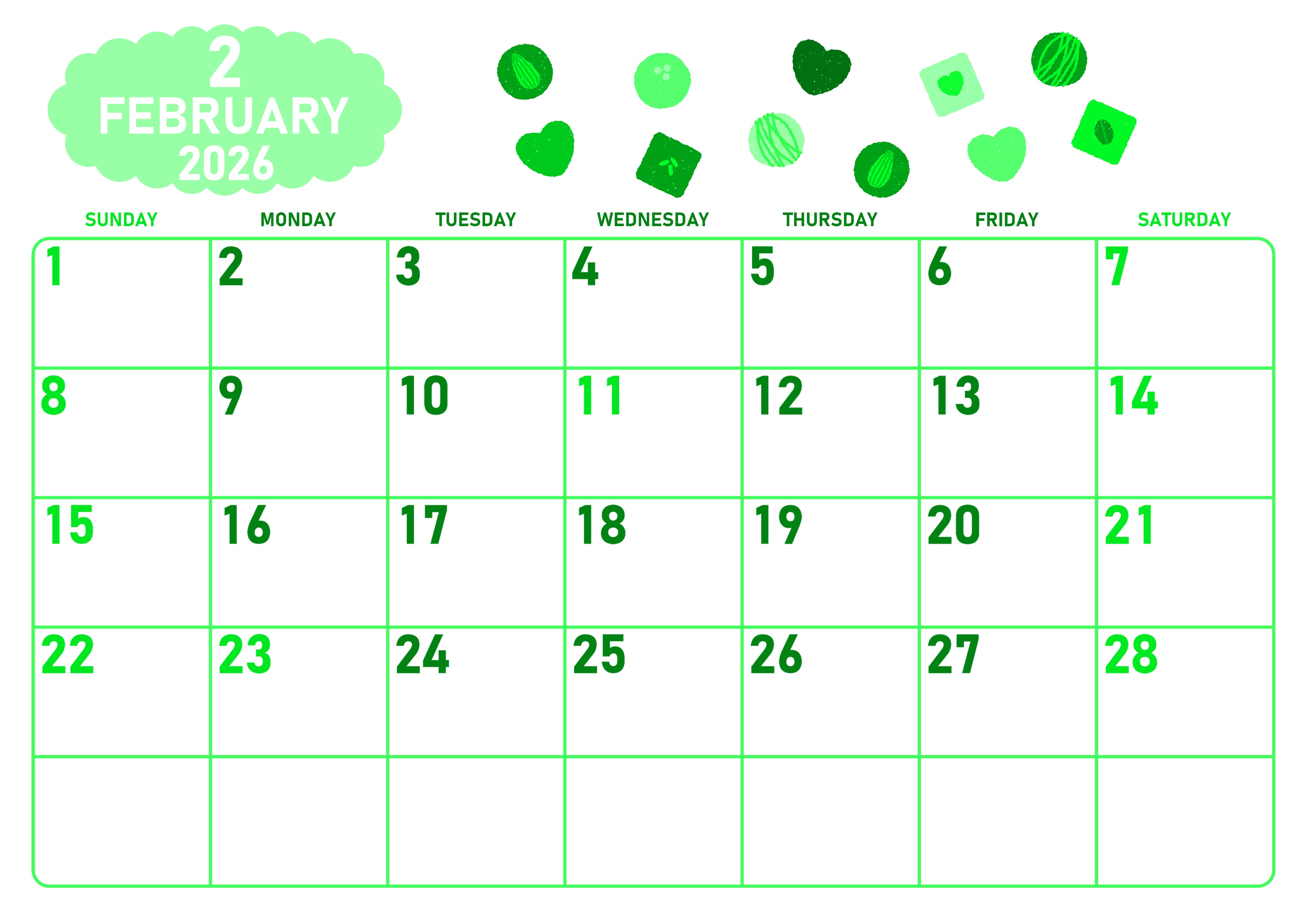 2026年・無料のカレンダーテンプレート 2026年2月横型日曜始まり チョコのイラストがかわいいA4無料グリーンのカレンダー(2026-00950200) 素材状デザイン王 2025年4月5日 2026年2月横型日曜始まりグリーンのカレンダーです。さまざまな形のチョコレートがウキウキ気分にさせてくれるおいしそうでかわいいイラストがバレンタインを彷彿とさせるA4グリーンのカレンダーです。(2026-00950200) 2月 横型のカレンダー 日曜始まり グリーン カレンダーデザイン-0095
