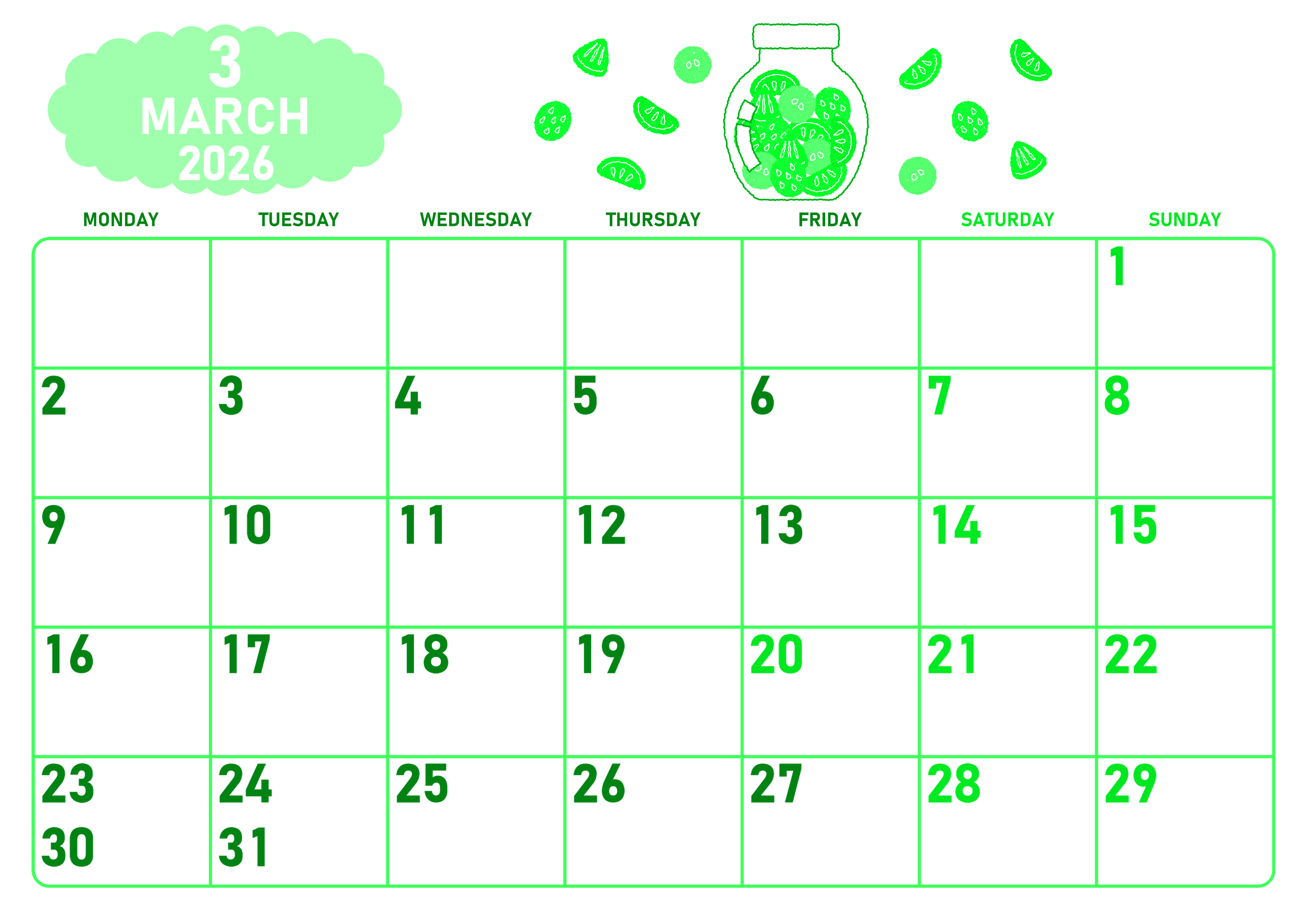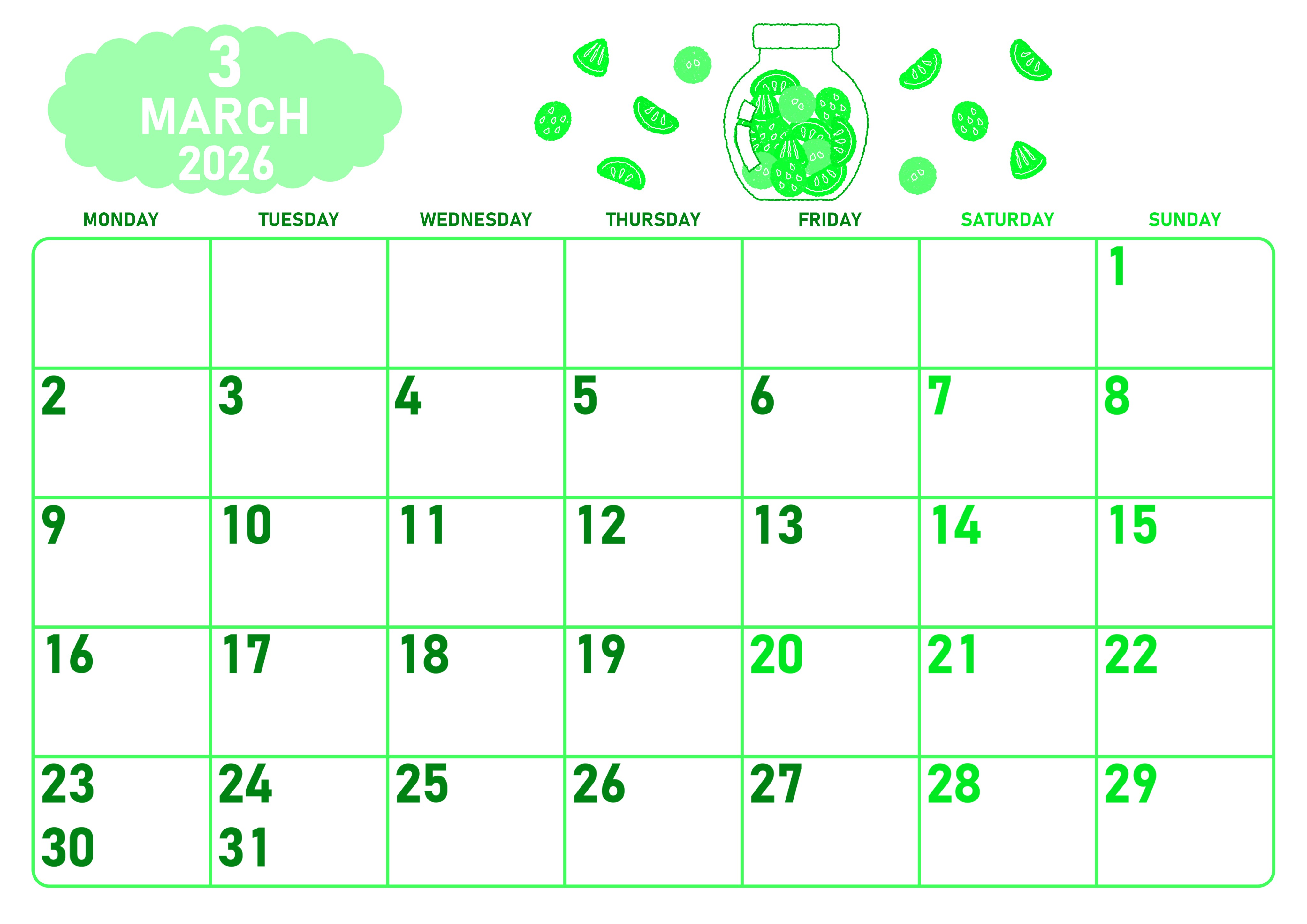 2026年3月横型月曜始まりの無料テンプレートグリーンのカレンダーです。色とりどりのみずみずしい果物の飴玉がポップでかわいい元気をもらえるグリーンのカレンダー素材はダウンロードが無料で月曜始まりです。(2026-00950301)