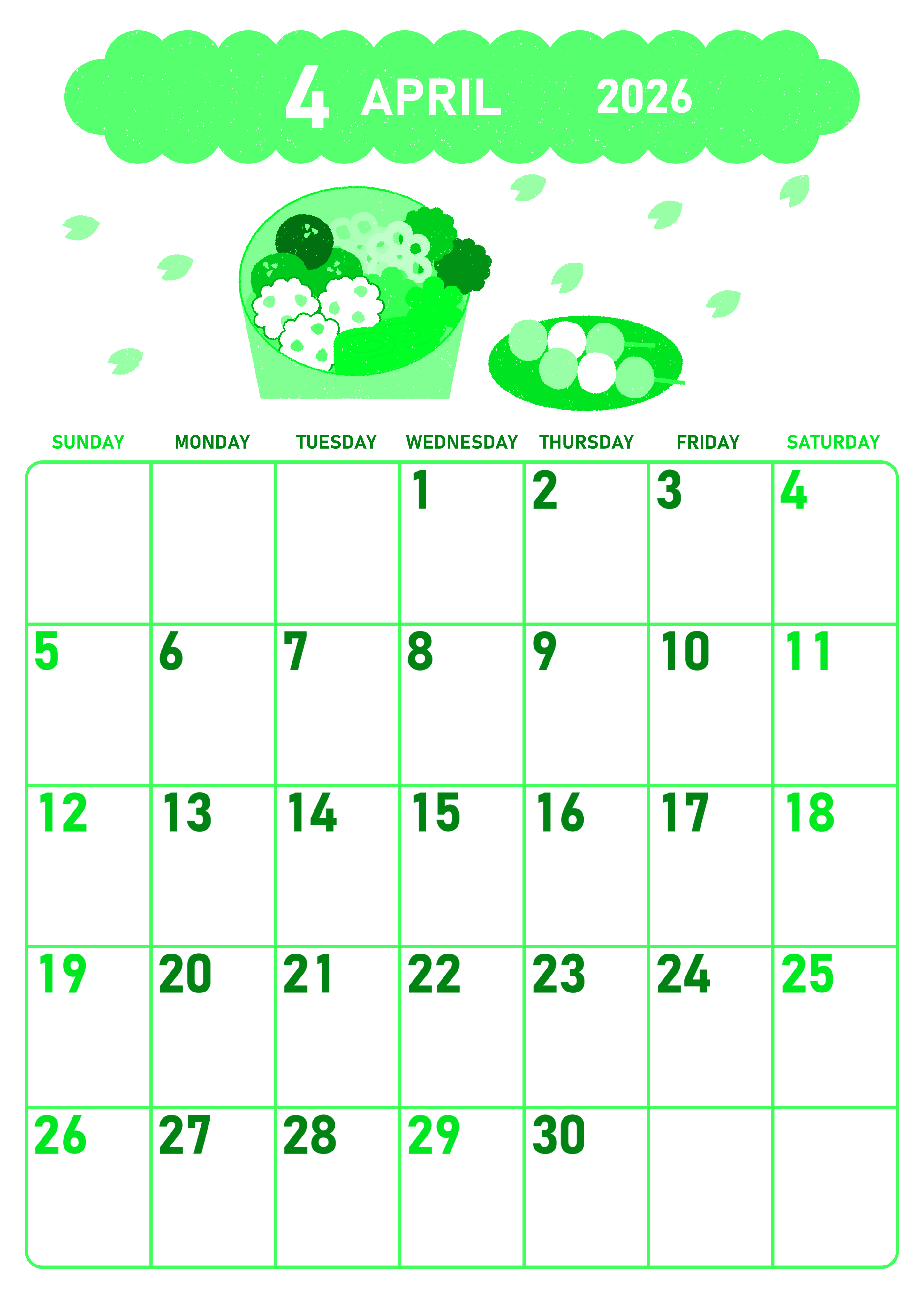 2026年4月縦型日曜始まりの無料テンプレートグリーンのカレンダーです。お花見の雰囲気がただようかわいいイラストのグリーンのカレンダーです。スケジュールを書き込む欄は大きめに確保してあるので沢山書き込みできるようになっています。(2026-00950410)