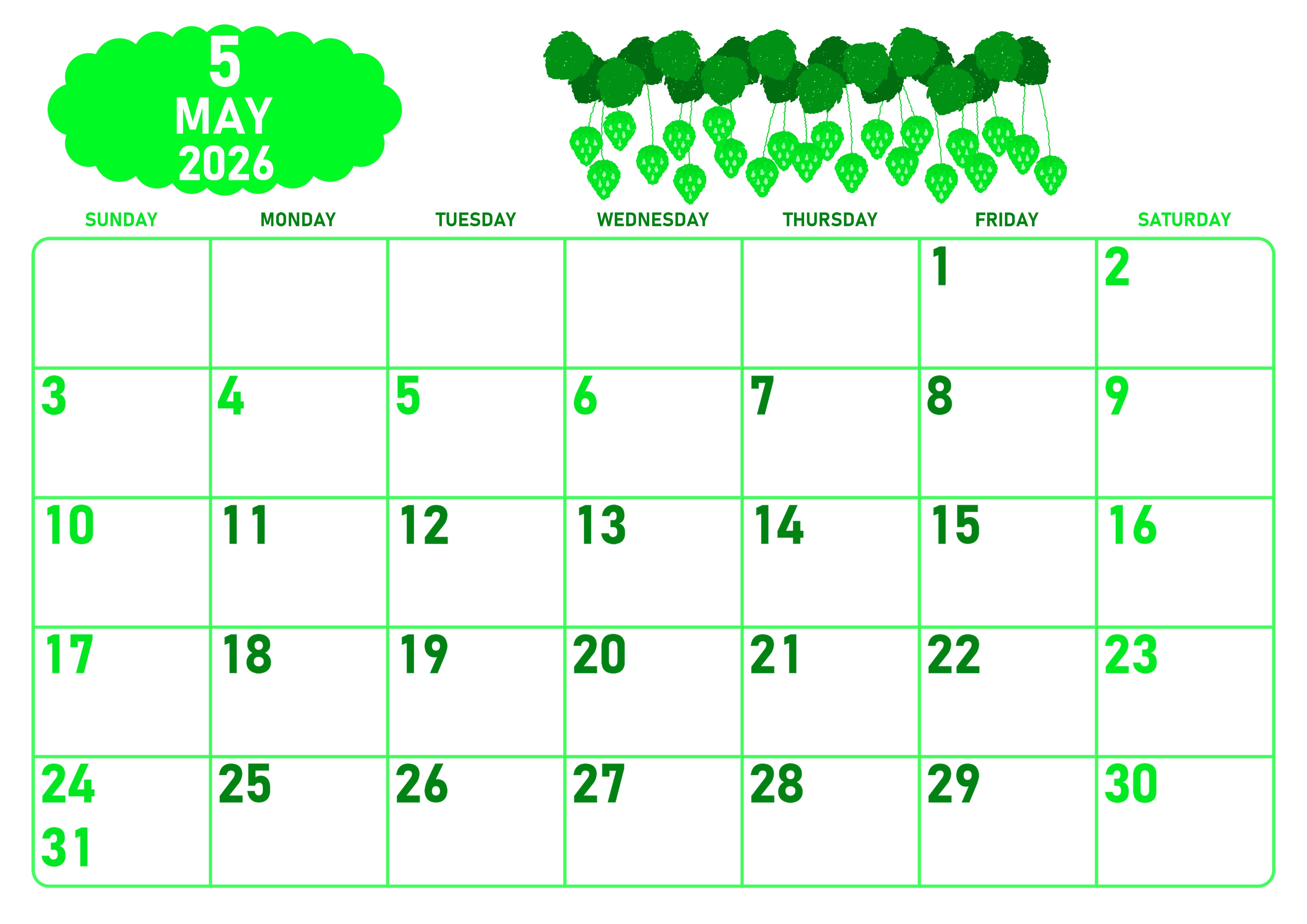 2026年5月横型日曜始まりの無料テンプレートグリーンのカレンダーです。いちごが豊作な新鮮フルーティでかわいいイラストのグリーンのカレンダーです。ペンで予定をどんどん書き込んで充実した5月にして下さい。(2026-00950500)