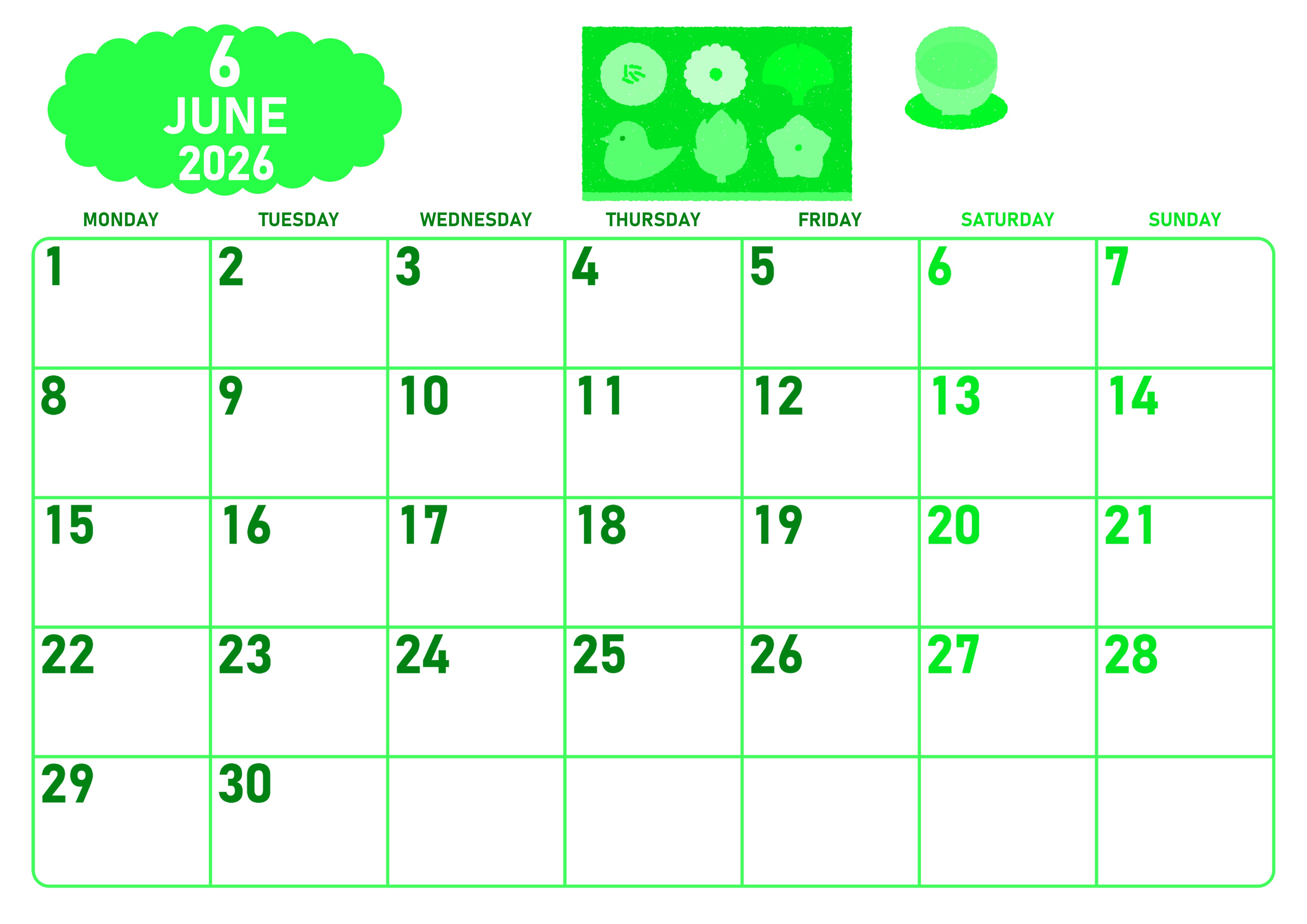 2026年6月横型月曜始まりの無料テンプレートグリーンのカレンダーです。月曜始まりで曜日の文字が色分けされているので見やすくて便利なグリーンのカレンダーです。和菓子と緑茶のイラストもかわいいです。(2026-00950601)
