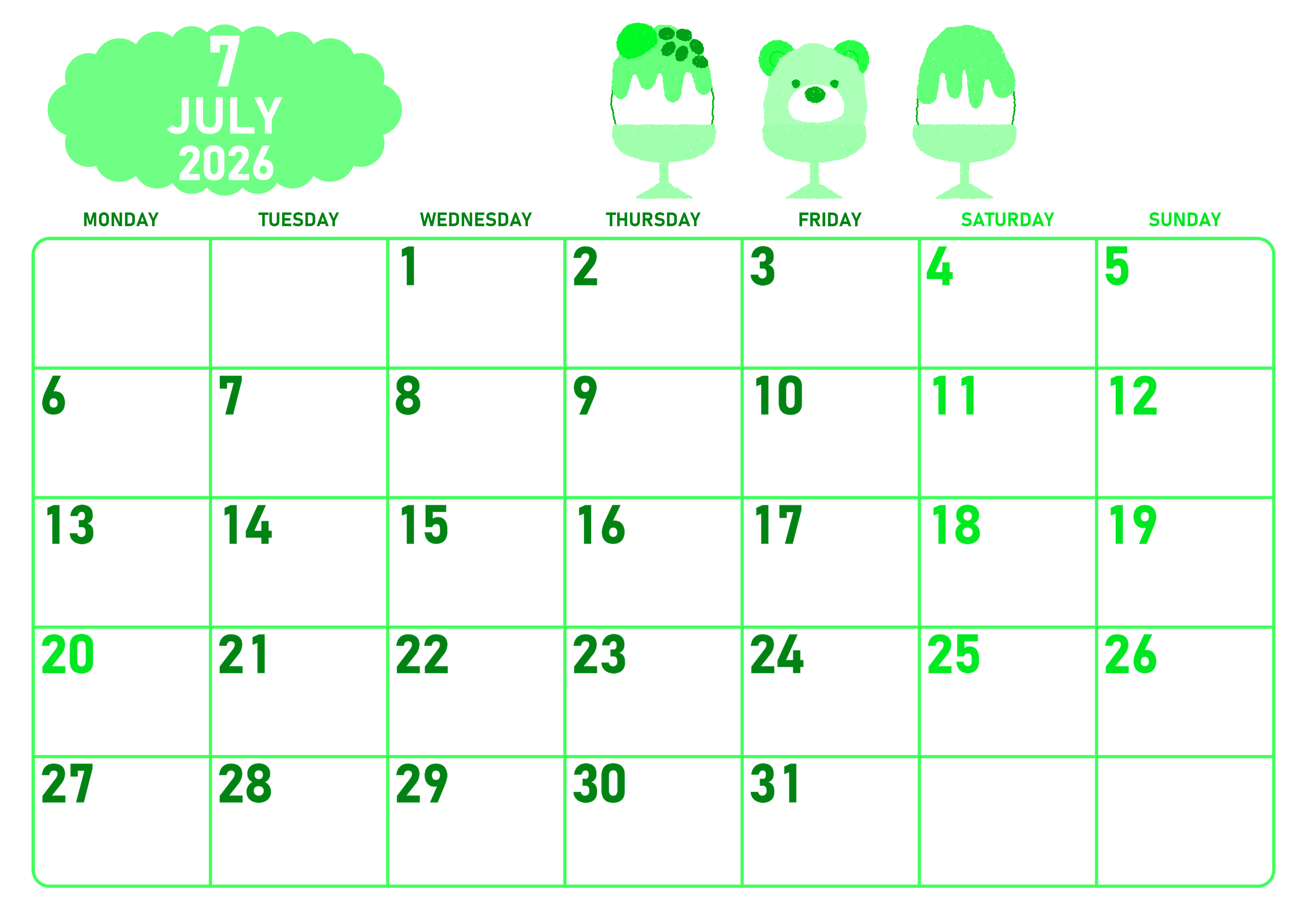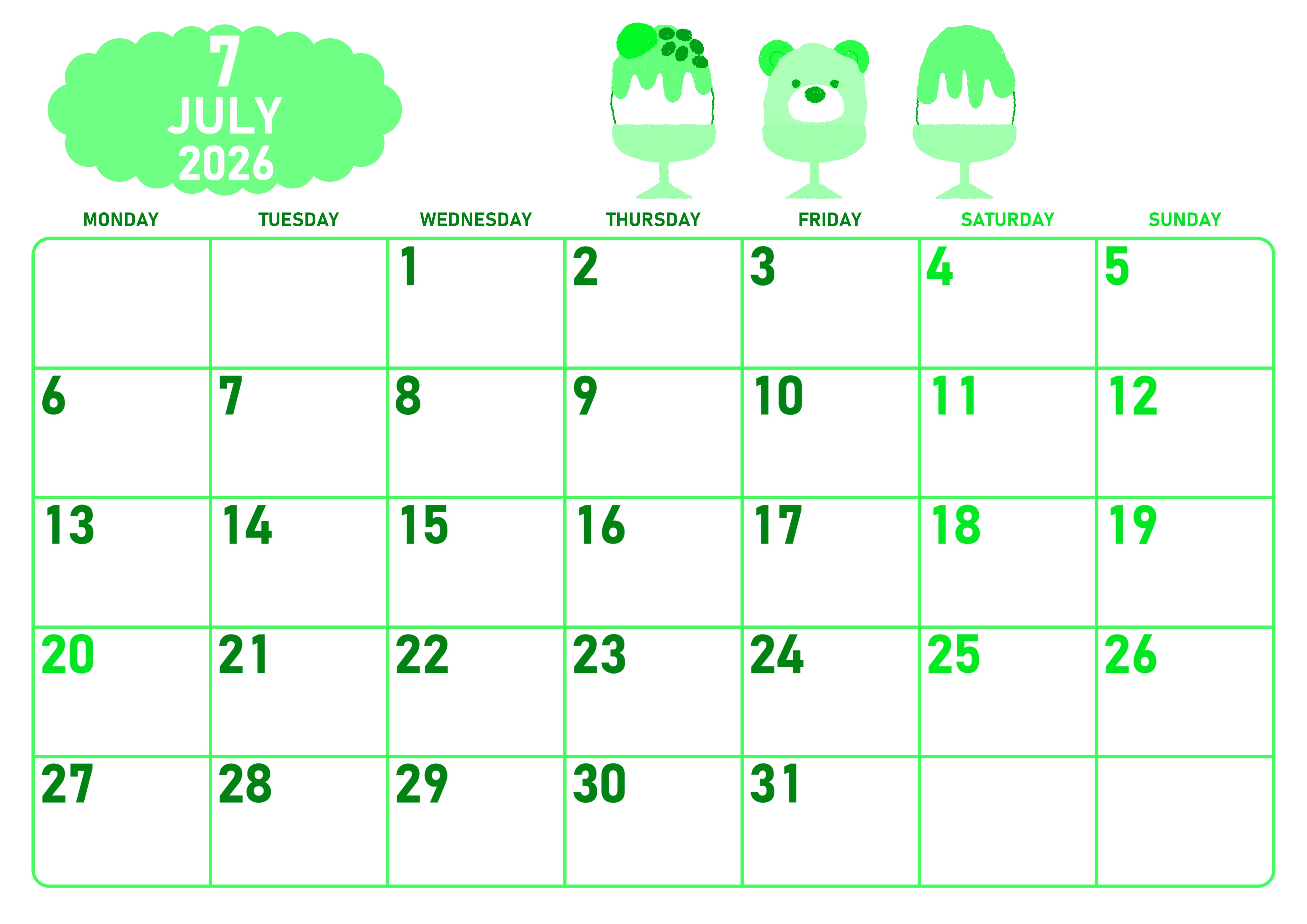 2026年7月横型月曜始まりの無料テンプレートグリーンのカレンダーです。月曜始まりで罫線が引かれているのでプランニングに役立つグリーンのカレンダーです。イラストは3つのかき氷を起用していて中央のデザインがクマで遊び心もあってかわいいです。(2026-00950701)