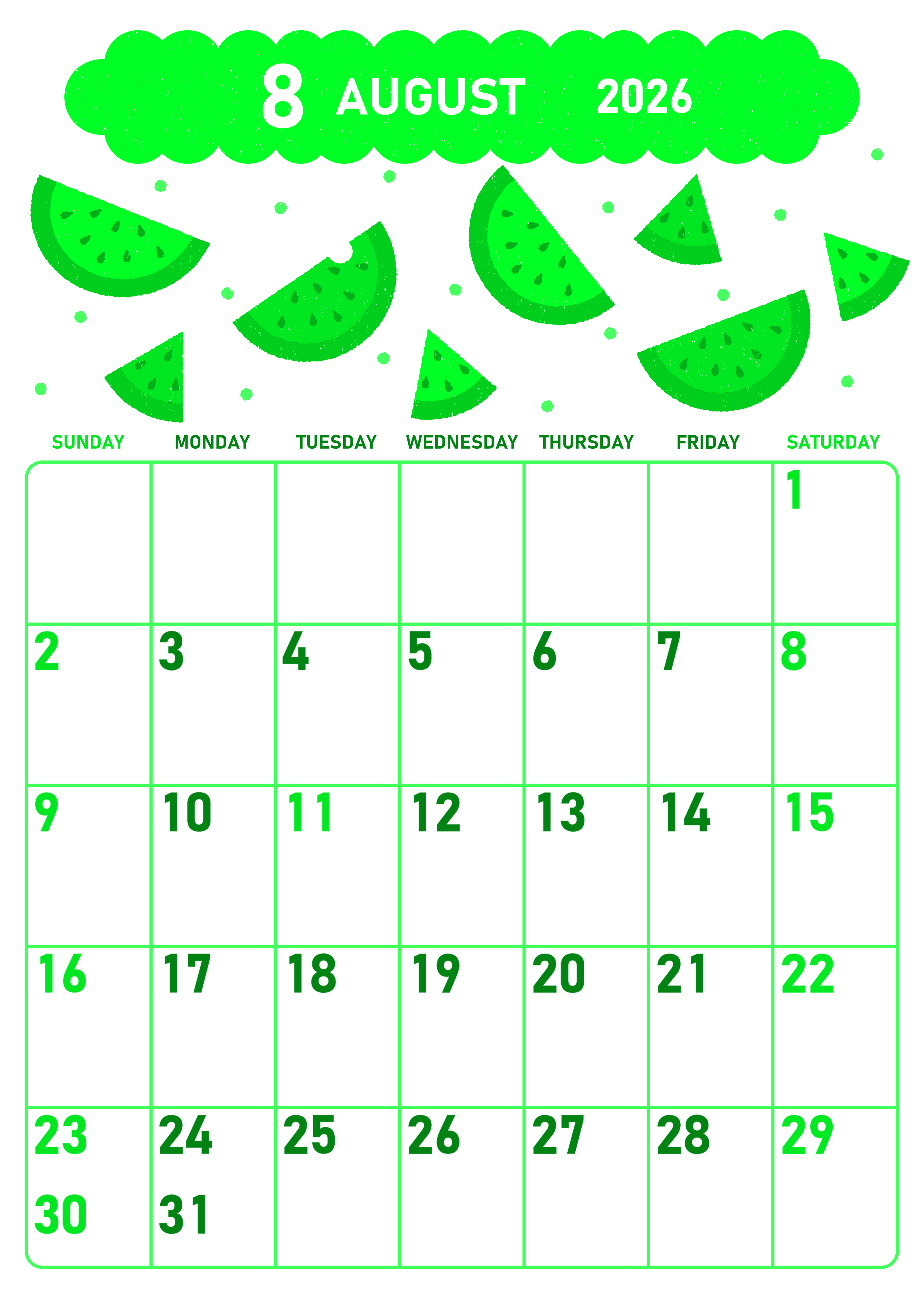 2026年8月縦型日曜始まりの無料テンプレートグリーンのカレンダーです。夏の季節の果物といえばスイカです。そのスイカを描き上げたかわいいイラストが魅力的です。グリーンのカレンダー部分も使いやすいフォーマットです。(2026-00950810)