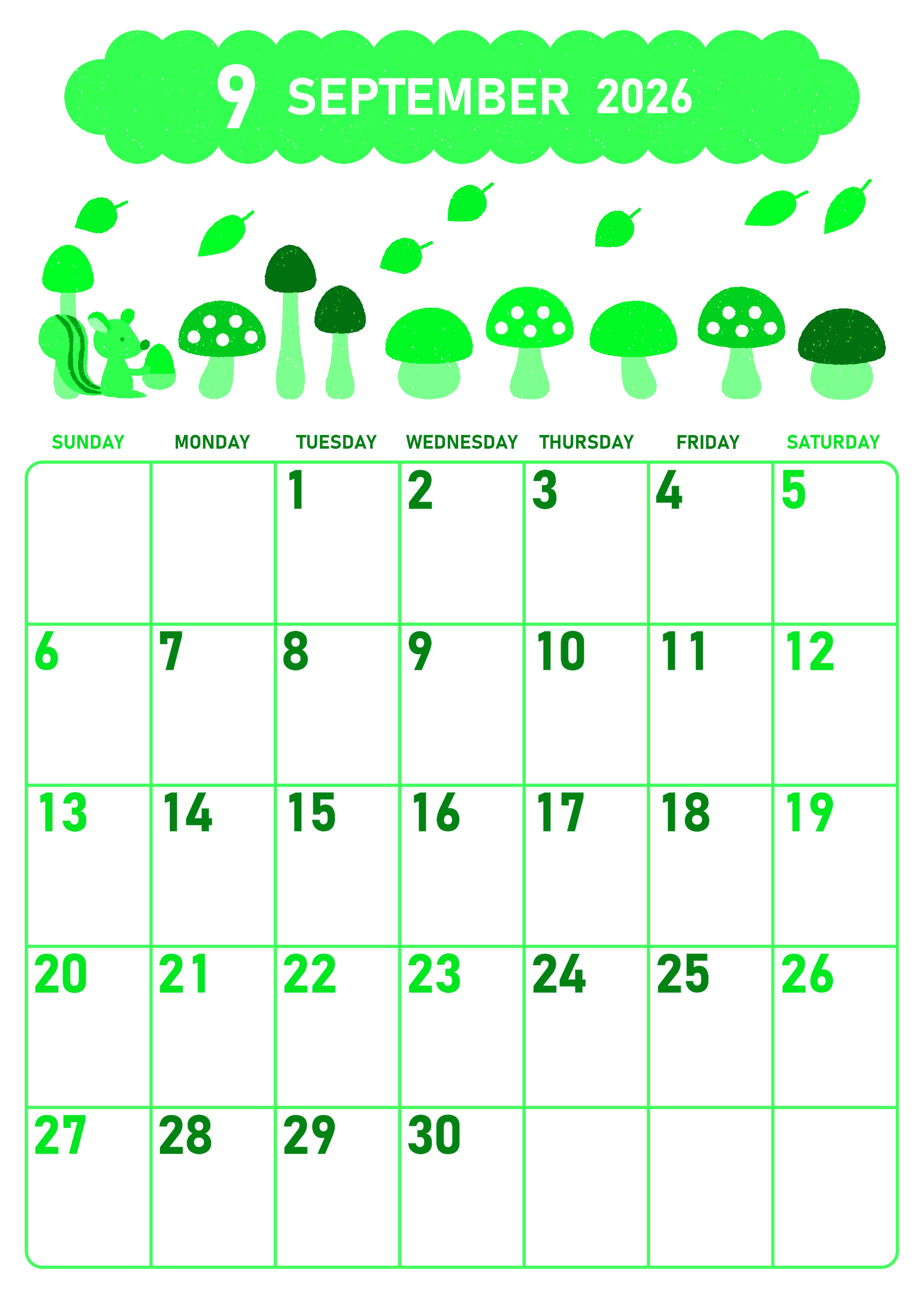 2026年9月縦型日曜始まり 秋の季節イラストがかわいいA4無料グリーンのカレンダー(2026-00950910)