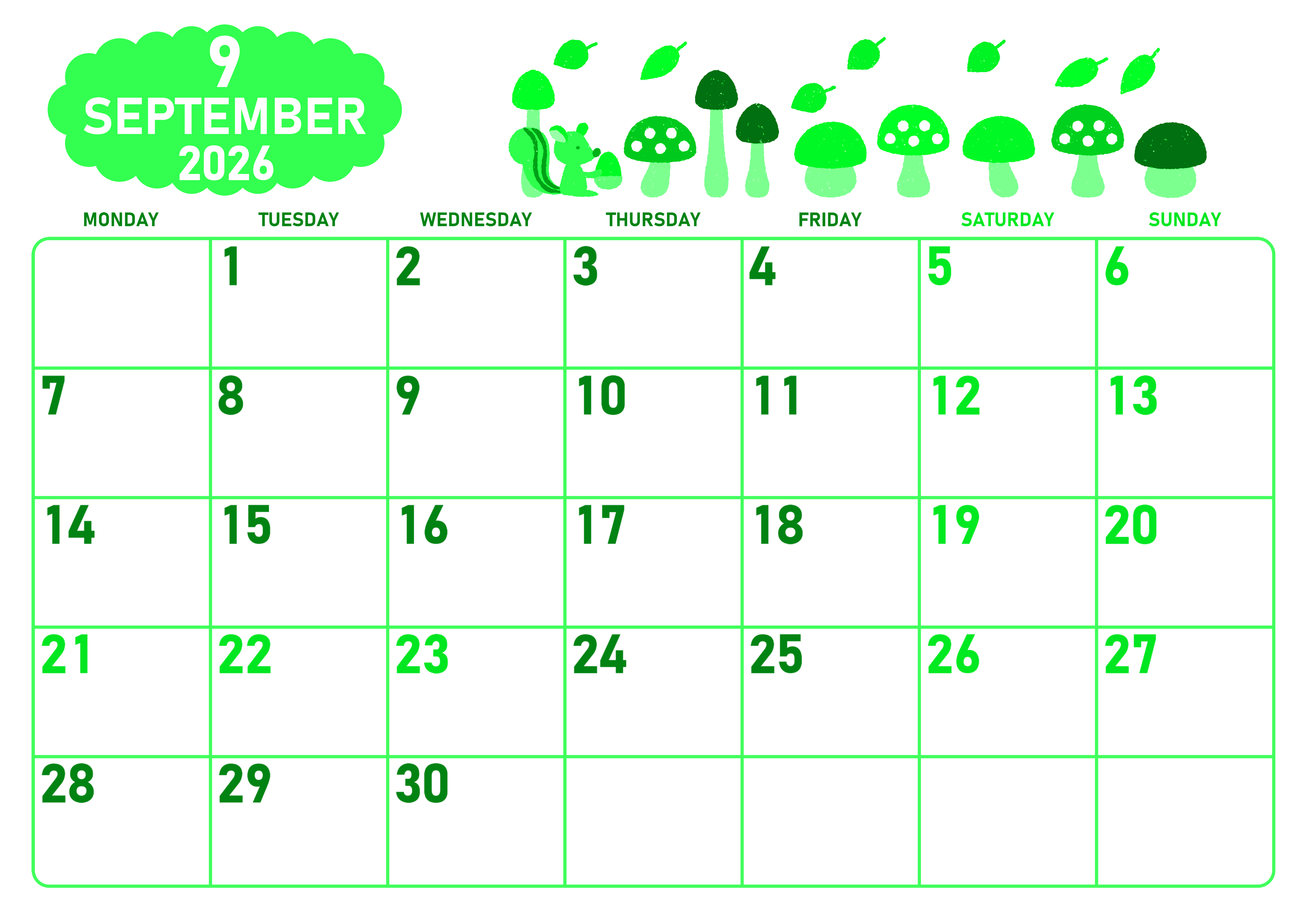 2026年・無料のカレンダーテンプレート 2026年9月横型月曜始まり 秋の季節イラストがかわいいA4無料グリーンのカレンダー(2026-00950901) 素材状デザイン王 2025年4月5日 2026年9月横型月曜始まりの無料テンプレートグリーンのカレンダーです。秋の季節をテーマにしているほのぼのとしたかわいいイラストに仕上がっています。(2026-00950901) 9月 横型のカレンダー 月曜始まり グリーン カレンダーデザイン-0095