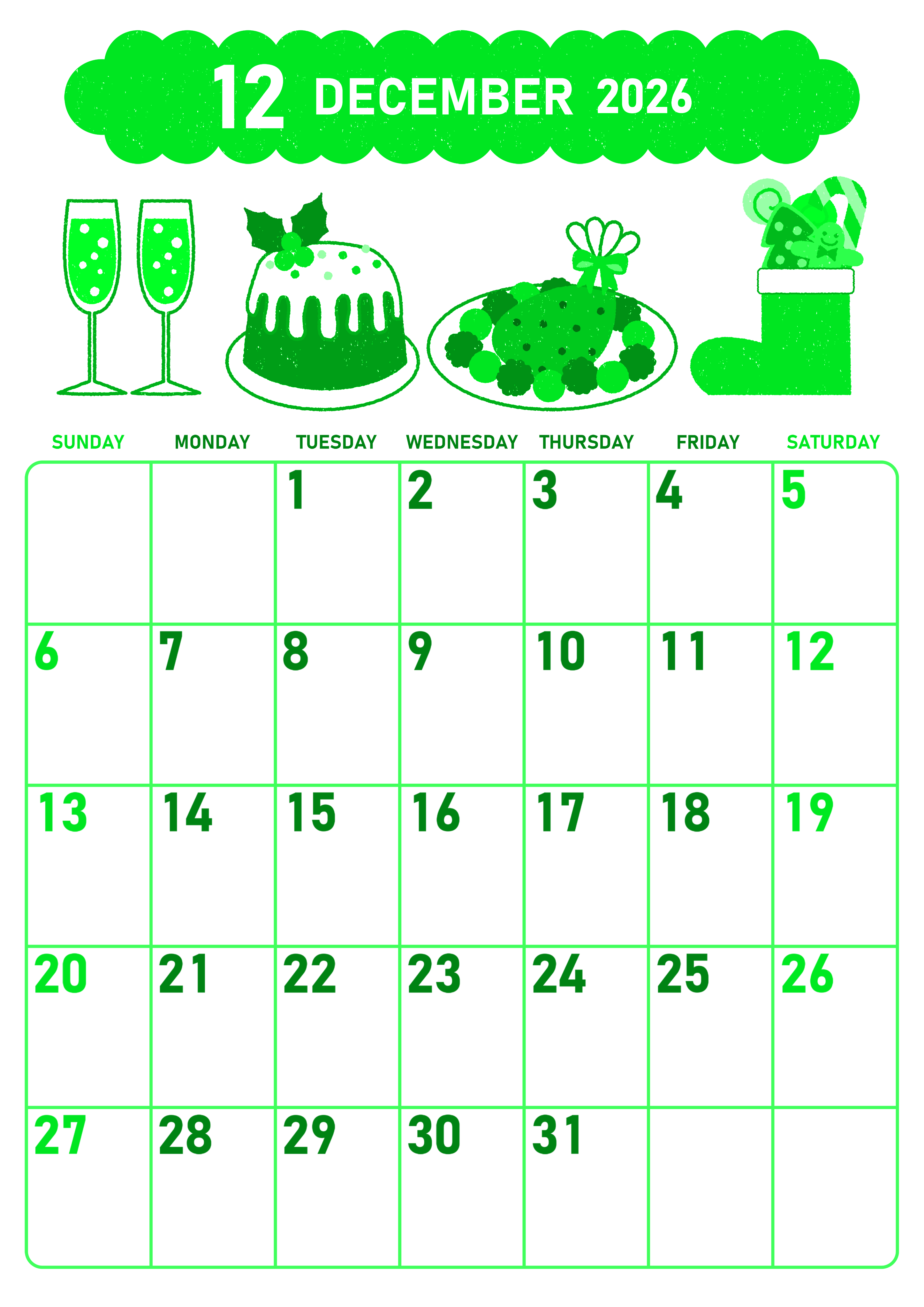2026年12月縦型日曜始まり 御馳走イラストのかわいいA4無料グリーンのカレンダー(2026-00951210)