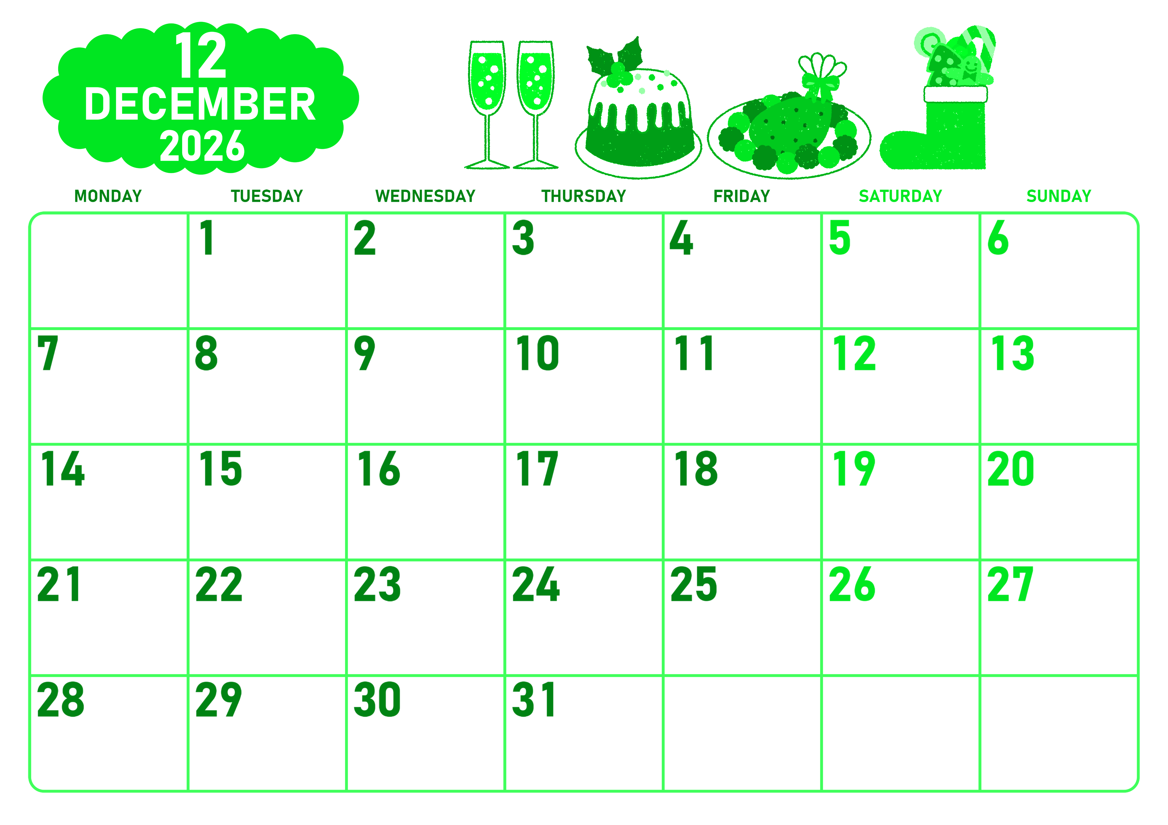 2026年・無料のカレンダーテンプレート 2026年12月横型月曜始まり 御馳走イラストのかわいいA4無料グリーンのカレンダー(2026-00951201) 素材状デザイン王 2025年4月5日 2026年12月横型月曜始まりの無料テンプレートグリーンのカレンダーです。クリスマスイブに食べたくなるような御馳走のイラストが目を引くかわいい素材です。月曜始まりタイプが好きな人へおすすめです。(2026-00951201) 12月 横型のカレンダー 月曜始まり グリーン カレンダーデザイン-0095
