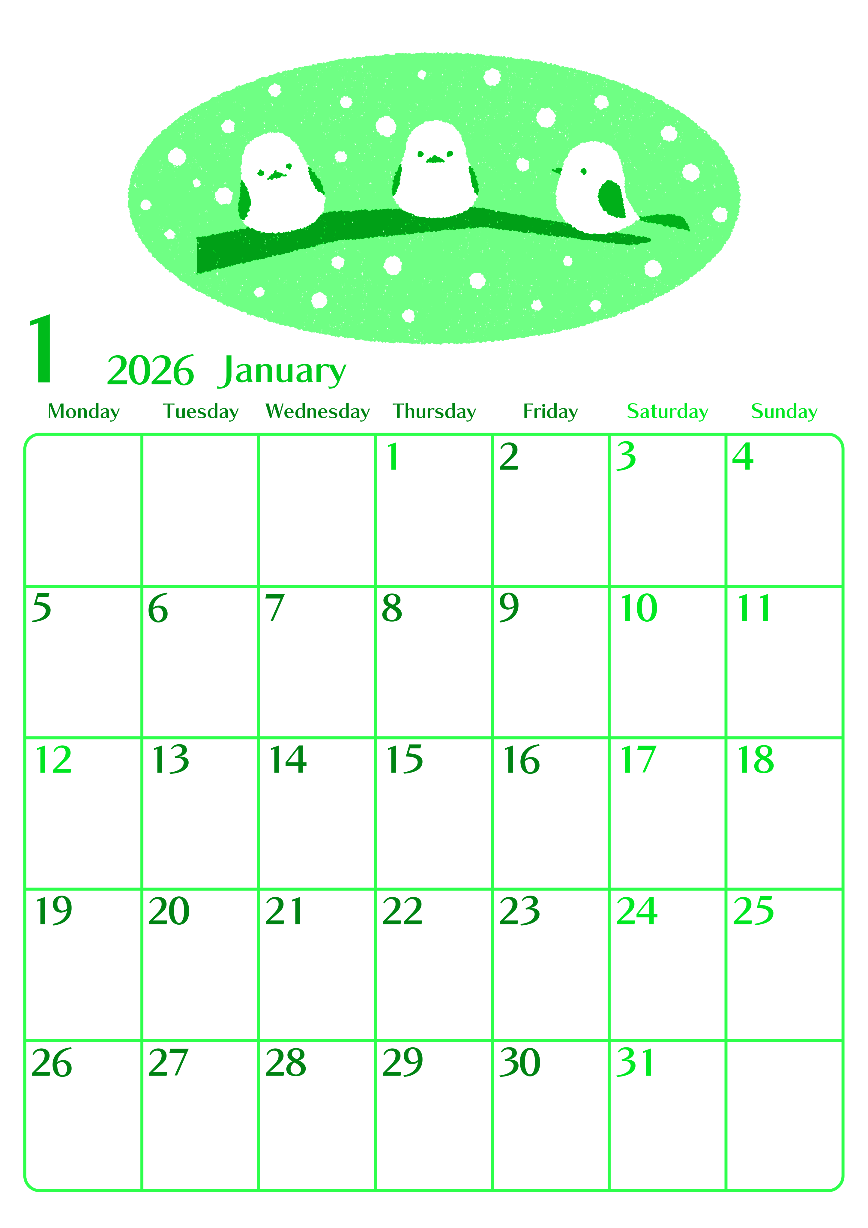 2026年・無料のカレンダーテンプレート 2026年1月縦型月曜始まり イラストのおしゃれA4無料グリーンのカレンダー(2026-00960111) 素材状デザイン王 2025年4月5日 2026年1月縦型月曜始まりの無料テンプレートグリーンのカレンダーです。新年のスタートダッシュを気持ちよく切れるようなスッキリ見やすいフリー素材です。(2026-00960111) 1月 縦型のカレンダー 月曜始まり グリーン カレンダーデザイン-0096