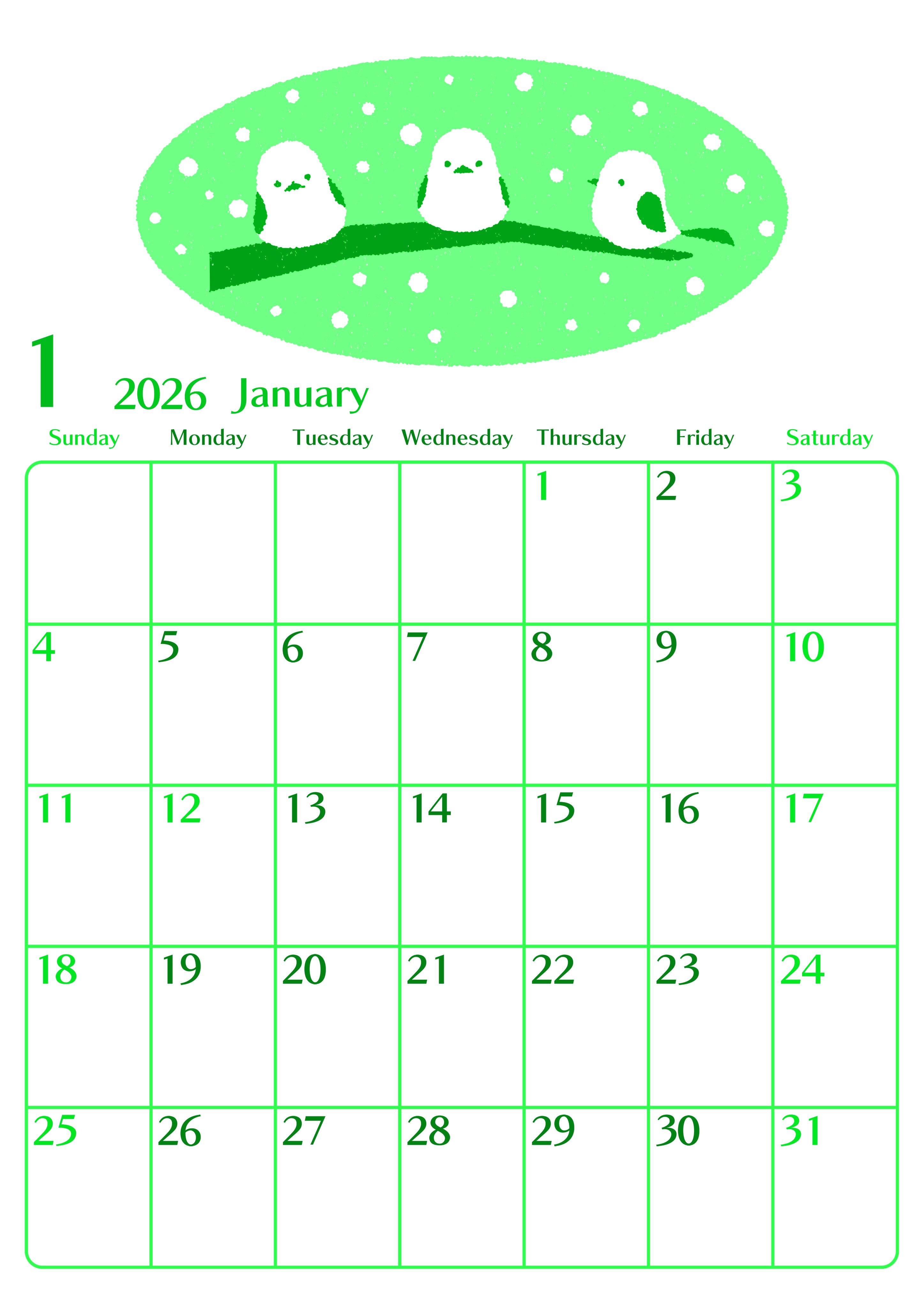2026年・無料のカレンダーテンプレート 2026年1月縦型日曜始まり イラストのおしゃれA4無料グリーンのカレンダー(2026-00960110) 素材状デザイン王 2025年4月5日 2026年1月縦型日曜始まりの無料テンプレートグリーンのカレンダーです。おしゃれなので飽きることなく使い続けられるようなデザインとなっています。(2026-00960110) 1月 縦型のカレンダー 日曜始まり グリーン カレンダーデザイン-0096
