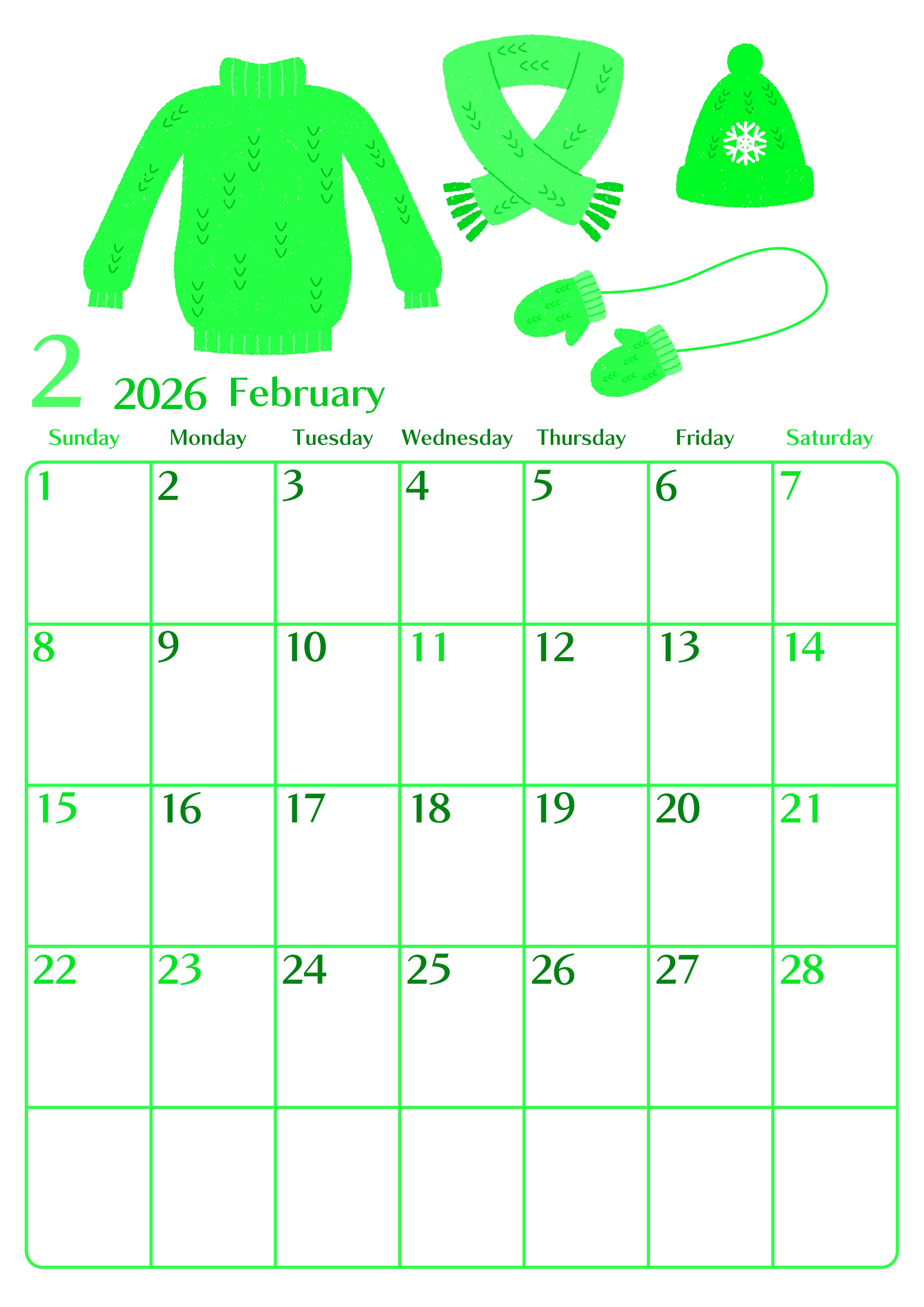 2026年・無料のカレンダーテンプレート 2026年2月縦型日曜始まり イラストのおしゃれA4無料グリーンのカレンダー(2026-00960210) 素材状デザイン王 2025年4月5日 2026年2月縦型日曜始まりの無料テンプレートグリーンのカレンダーです。壁に貼って使うもよし、ファイリングをして持ち歩くもよし、用途は幅広いです。(2026-00960210) 2月 縦型のカレンダー 日曜始まり グリーン カレンダーデザイン-0096