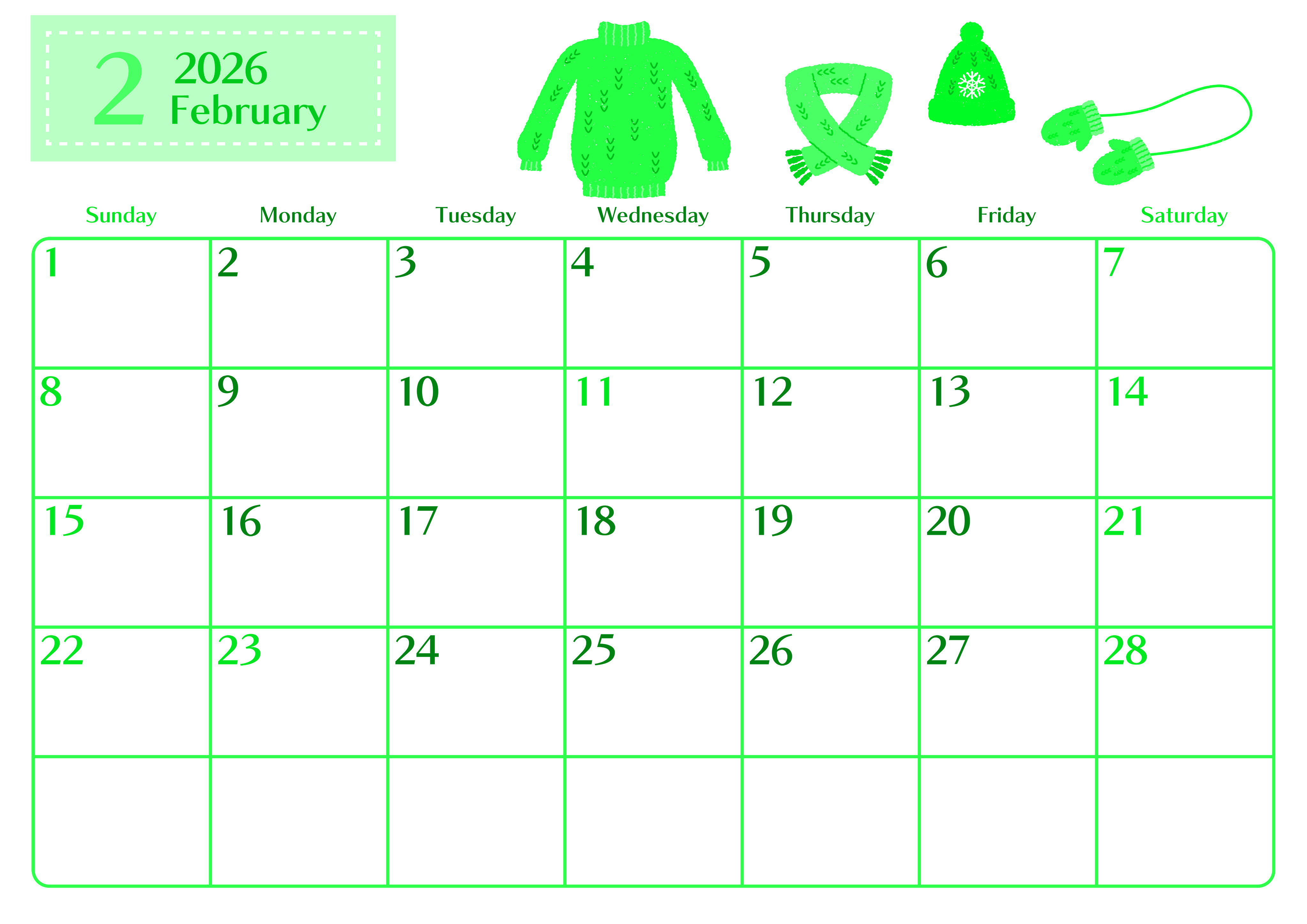 2026年2月横型日曜始まりの無料テンプレートグリーンのカレンダーです。マフラーやセーターや手袋といった暖をとるためのウェアを散りばめたイラストがおしゃれです。余白もたっぷりあるので実用性も高いグリーンのカレンダーとなっています。(2026-00960200)