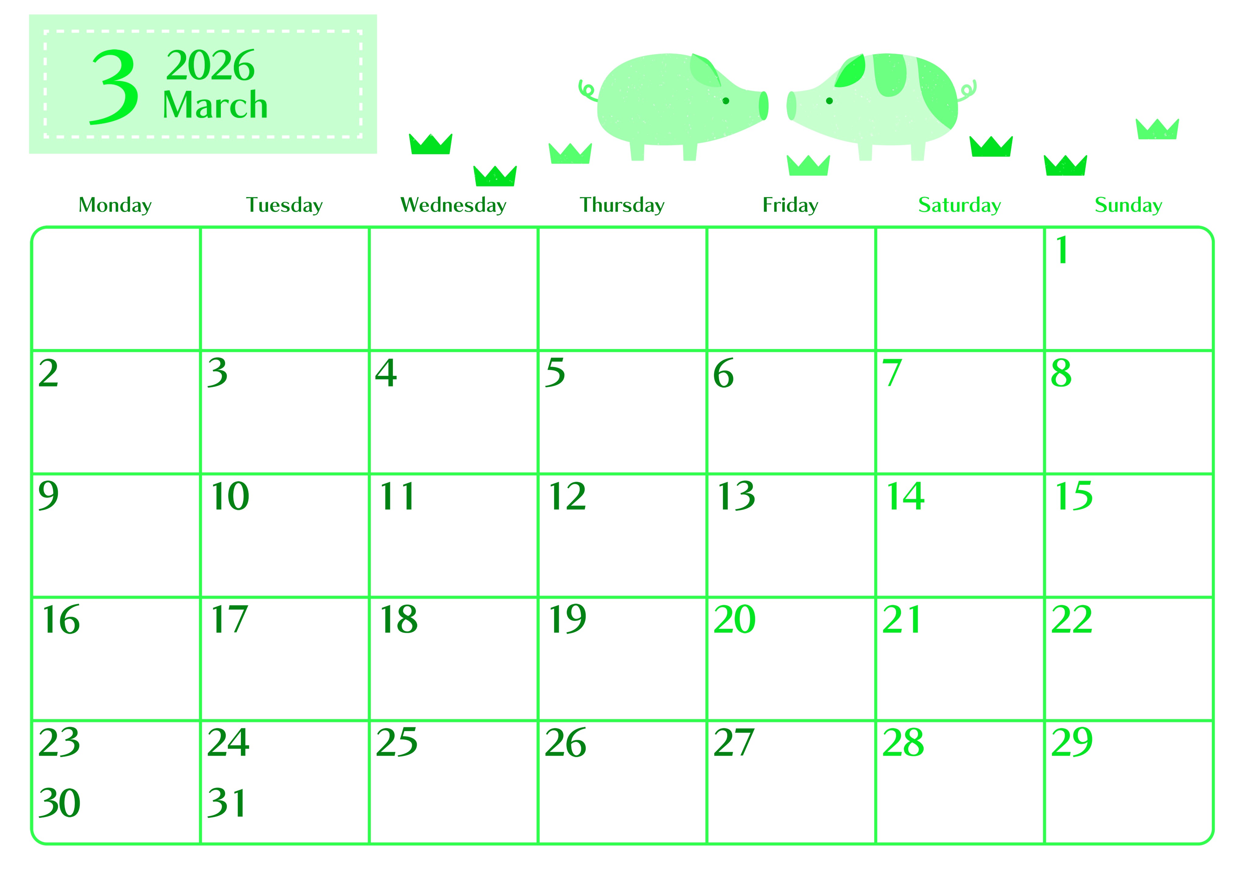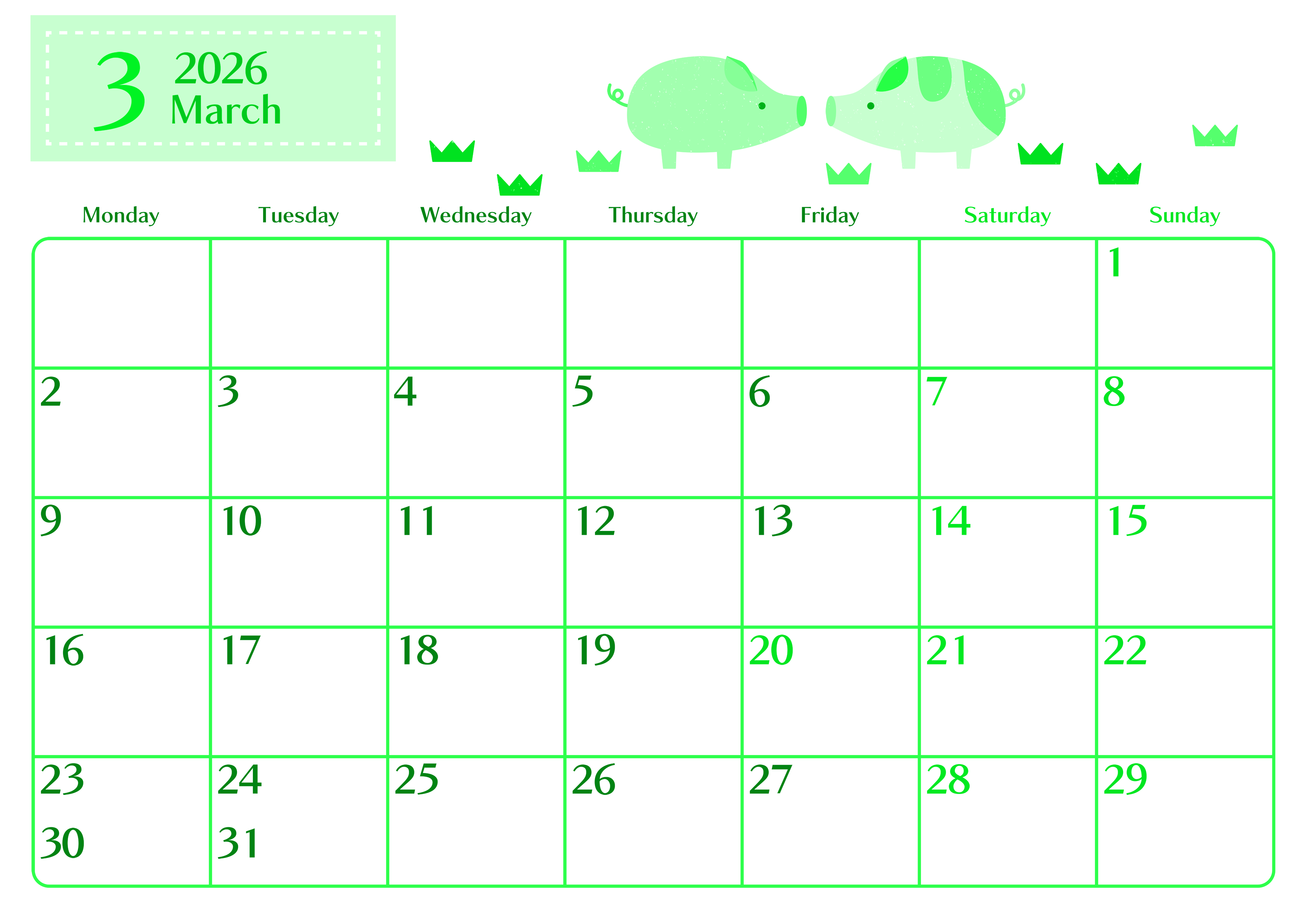 2026年3月横型月曜始まりの無料テンプレートグリーンのカレンダーです。アニマルのイラストがふわふわとしていておしゃれな使っていて楽しくなるような予定を充実させることのできるグリーンのカレンダーです。(2026-00960301)