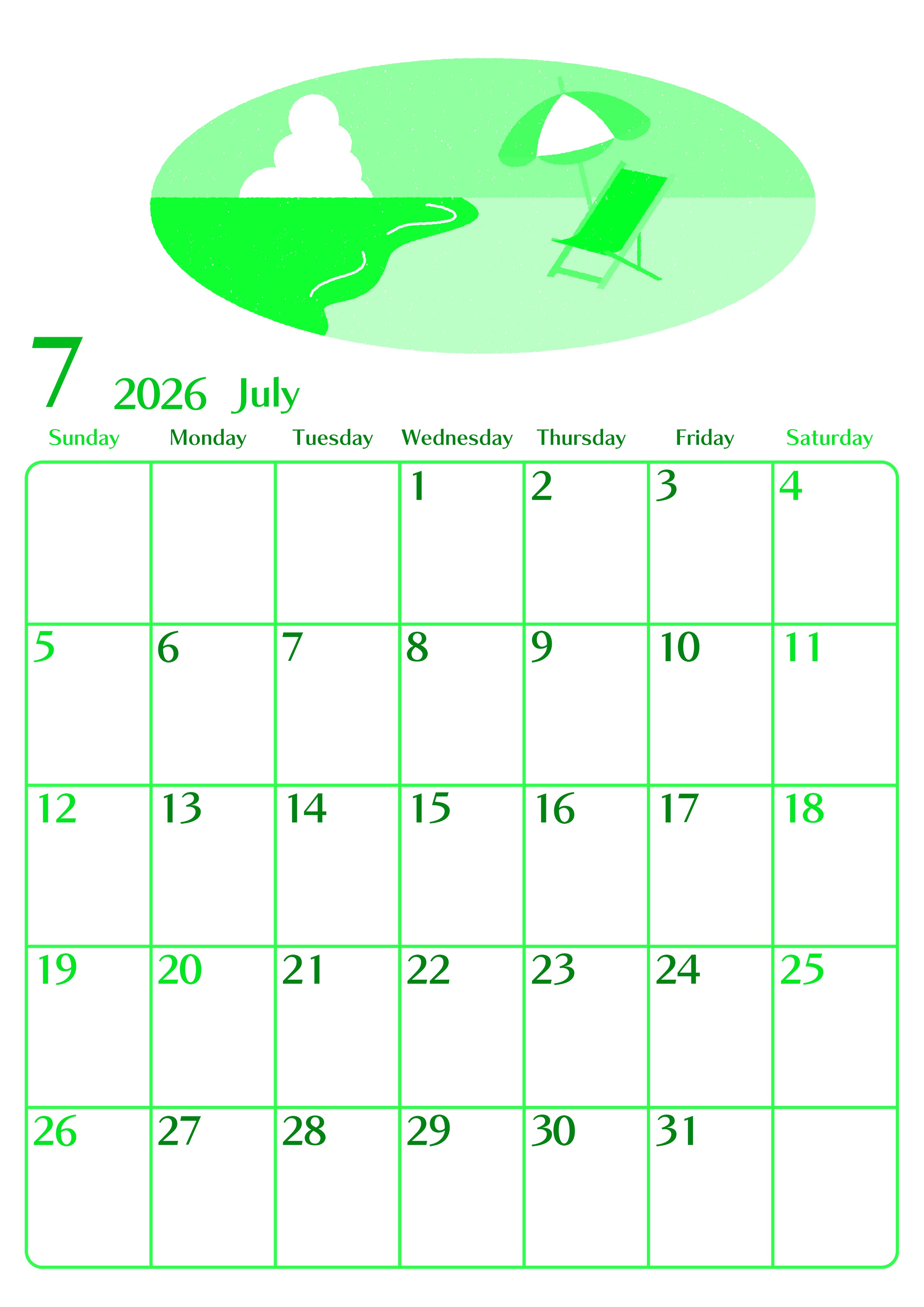 2026年7月縦型日曜始まりの無料テンプレートグリーンのカレンダーです。南国 バカンスをテーマにしたおしゃれなイラストが添えらえれている縦型でスケジュールをたっぷり書き込めるようなレイアウトのフリー素材です。(2026-00960710)