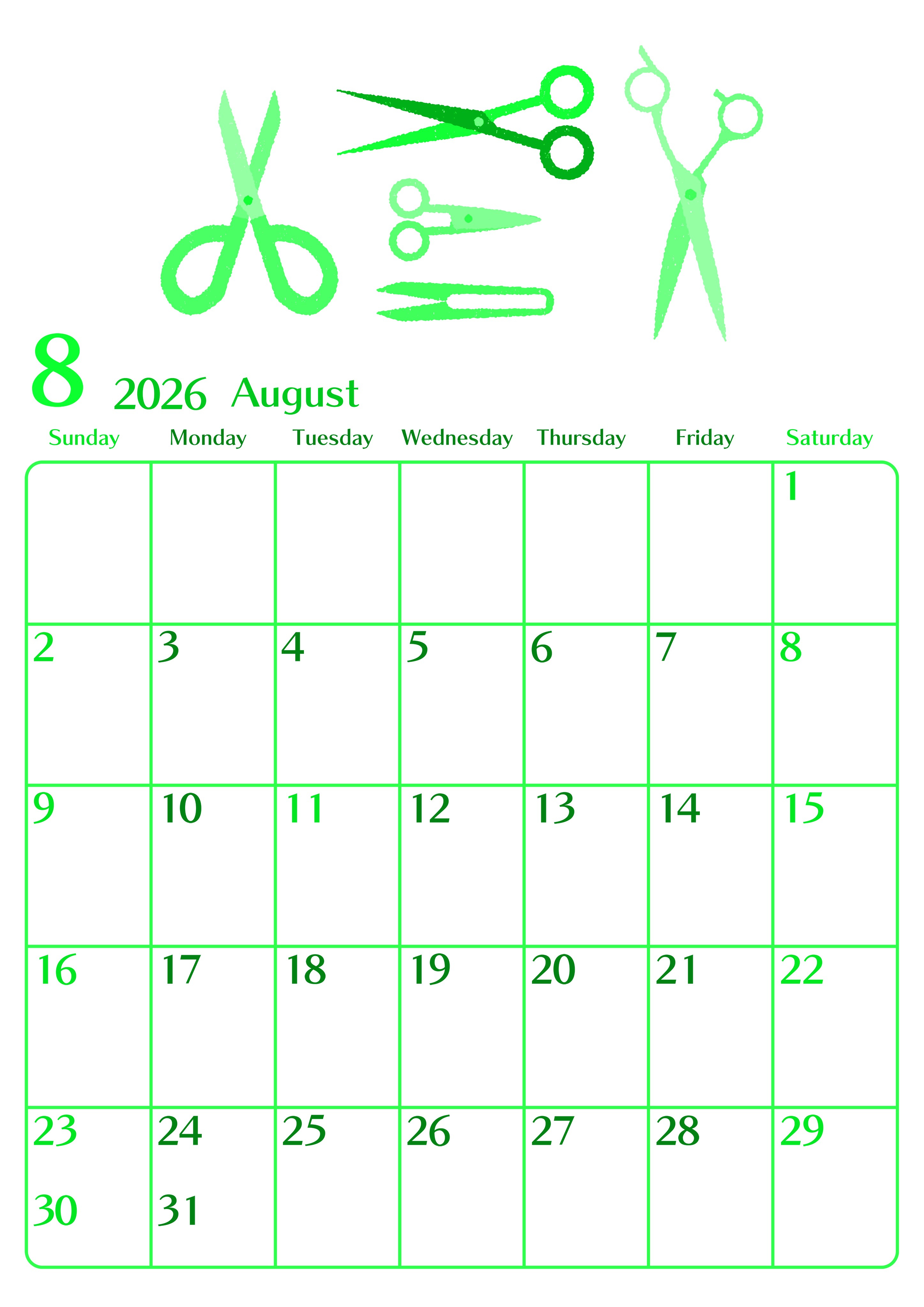 2026年8月縦型日曜始まりの無料テンプレートグリーンのカレンダーです。忙しい夏休みを充実させるためにぴったりのおしゃれなハサミのイラストグリーンのカレンダーはダウンロードが無料で便利な縦型レイアウトです。(2026-00960810)