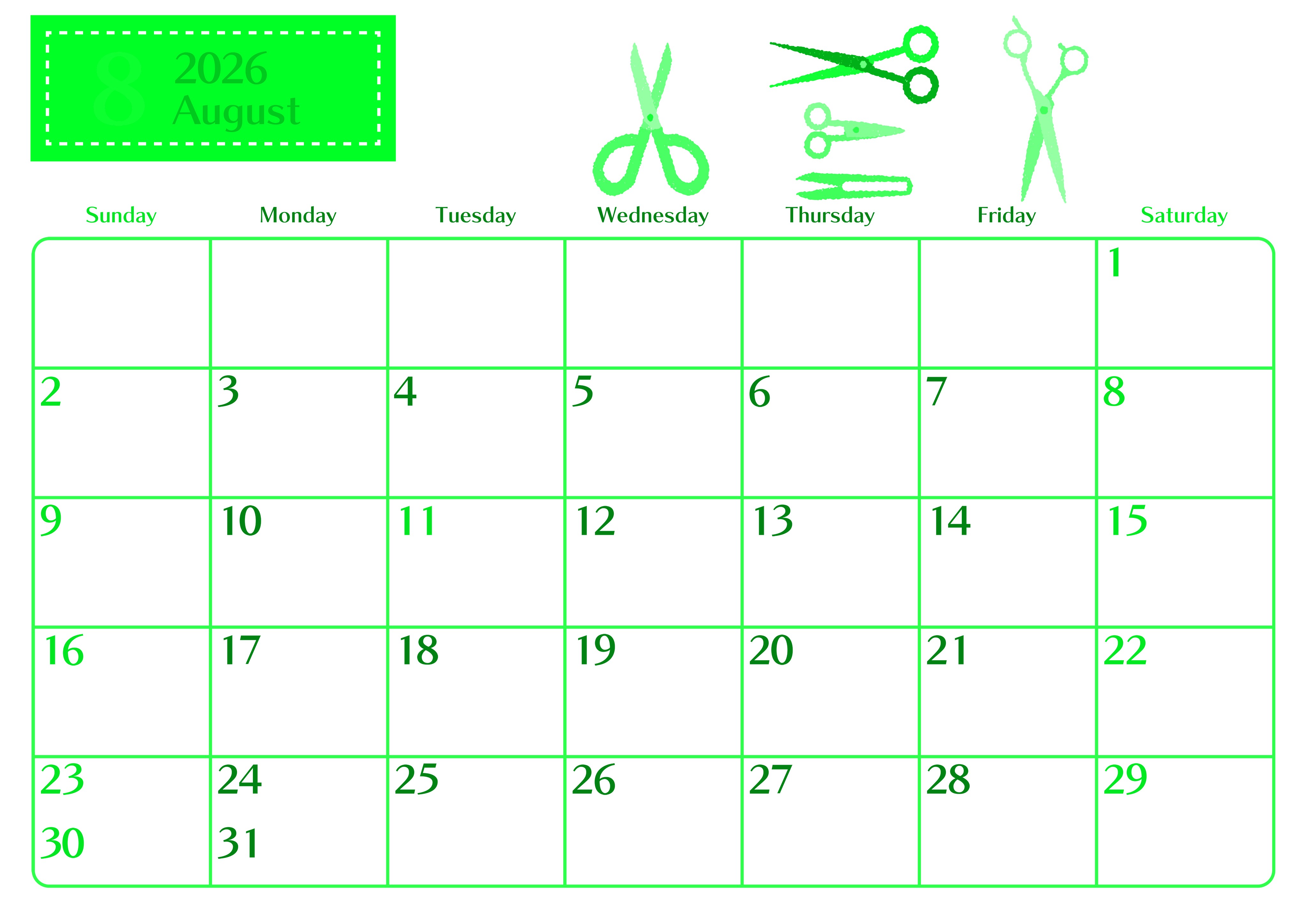 2026年・無料のカレンダーテンプレート 2026年8月横型日曜始まり ハサミイラストのおしゃれA4無料グリーンのカレンダー(2026-00960800) 素材状デザイン王 2025年4月5日 2026年8月横型日曜始まりの無料テンプレートグリーンのカレンダーです。いろいろなタイプのハサミのイラストがちりばめられていて文房具好きにはたまらないおしゃれなデザインのフリー素材となっています。(2026-00960800) 8月 横型のカレンダー 日曜始まり グリーン カレンダーデザイン-0096