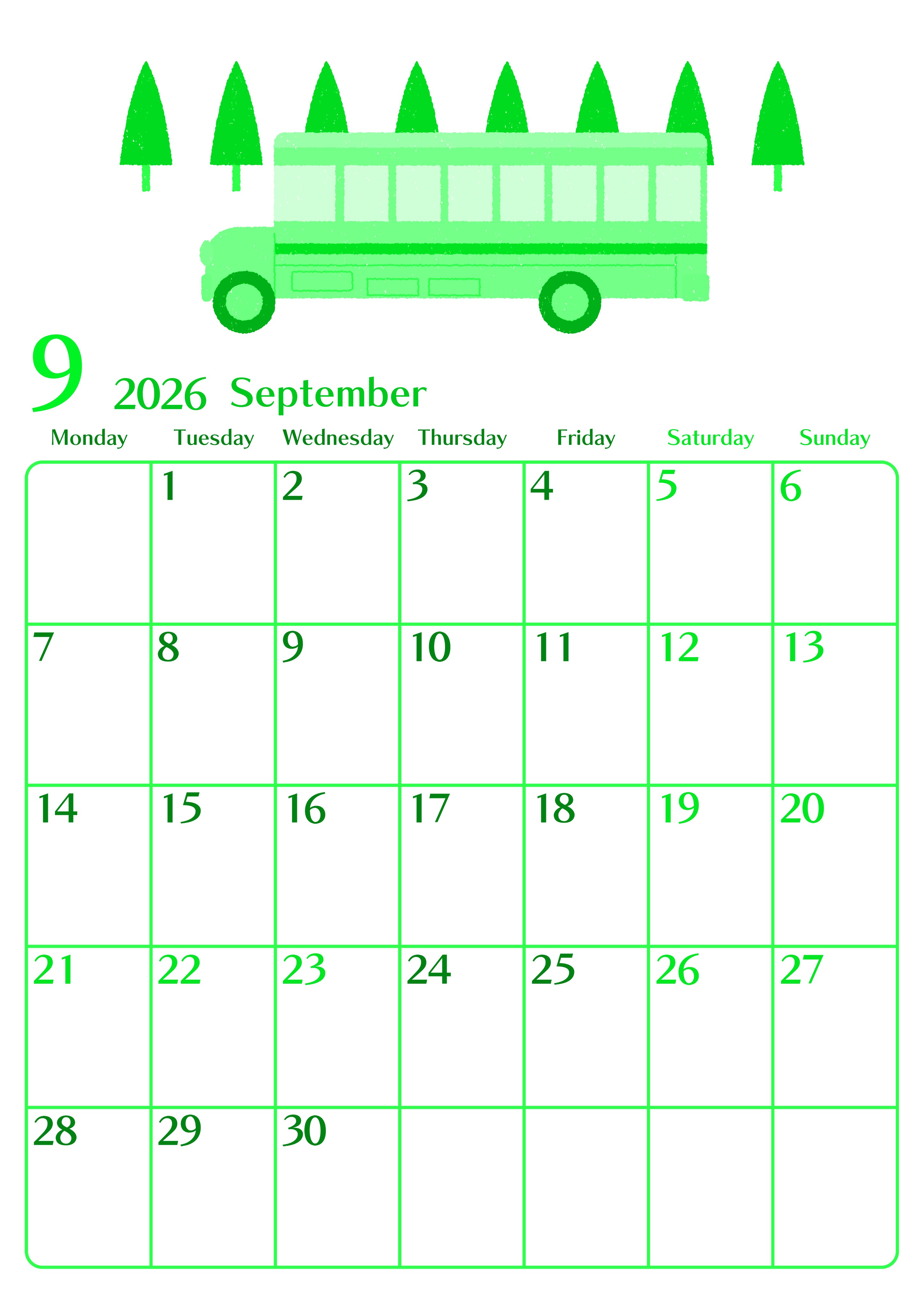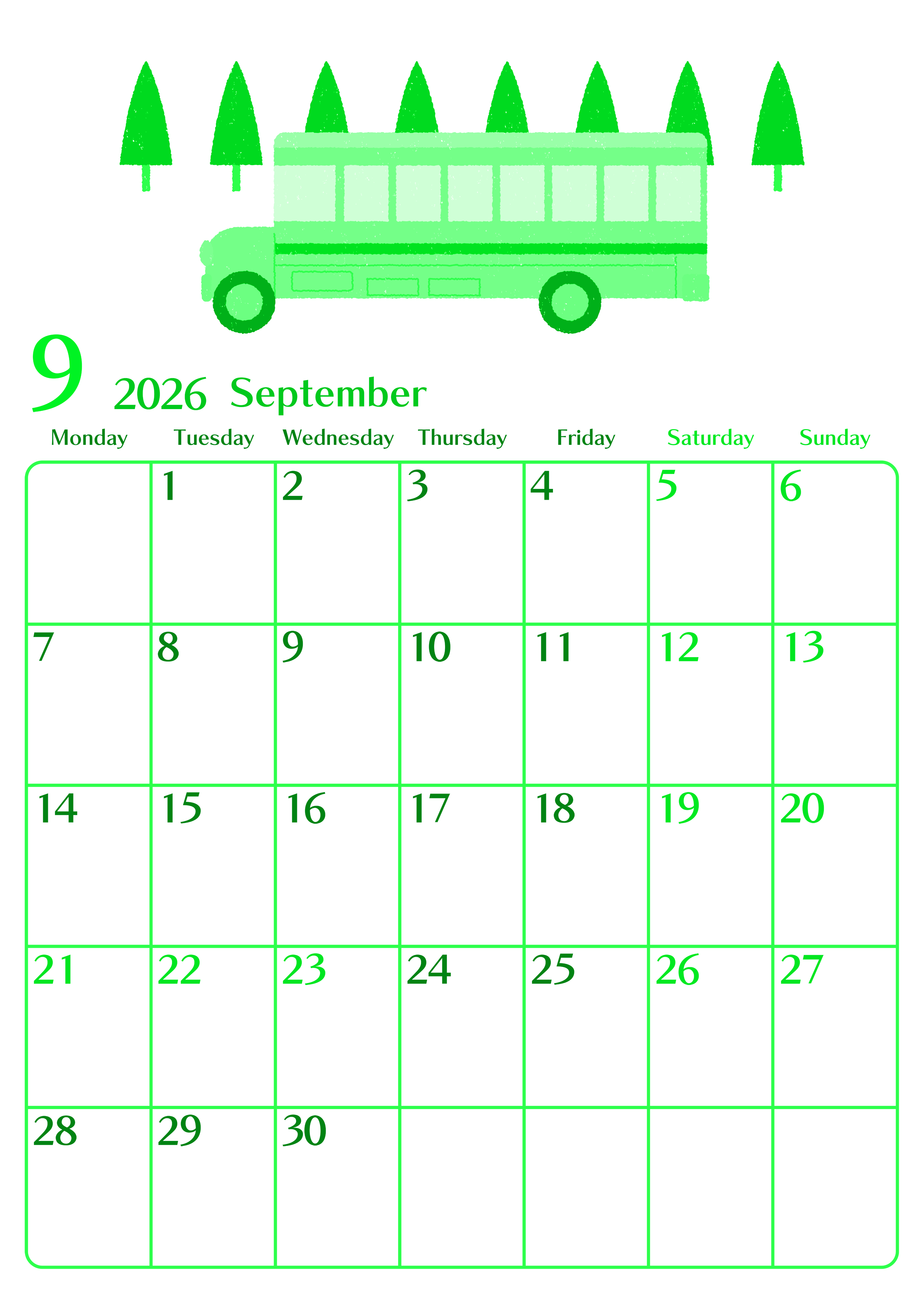 2026年9月縦型月曜始まりの無料テンプレートグリーンのカレンダーです。新学期の勉強の予定を整理整頓して書き込むのにも向いているだけでなく、グリーンのカレンダー上部のバスのイラストがおとなっぽいおしゃれさを醸し出しています。(2026-00960911)