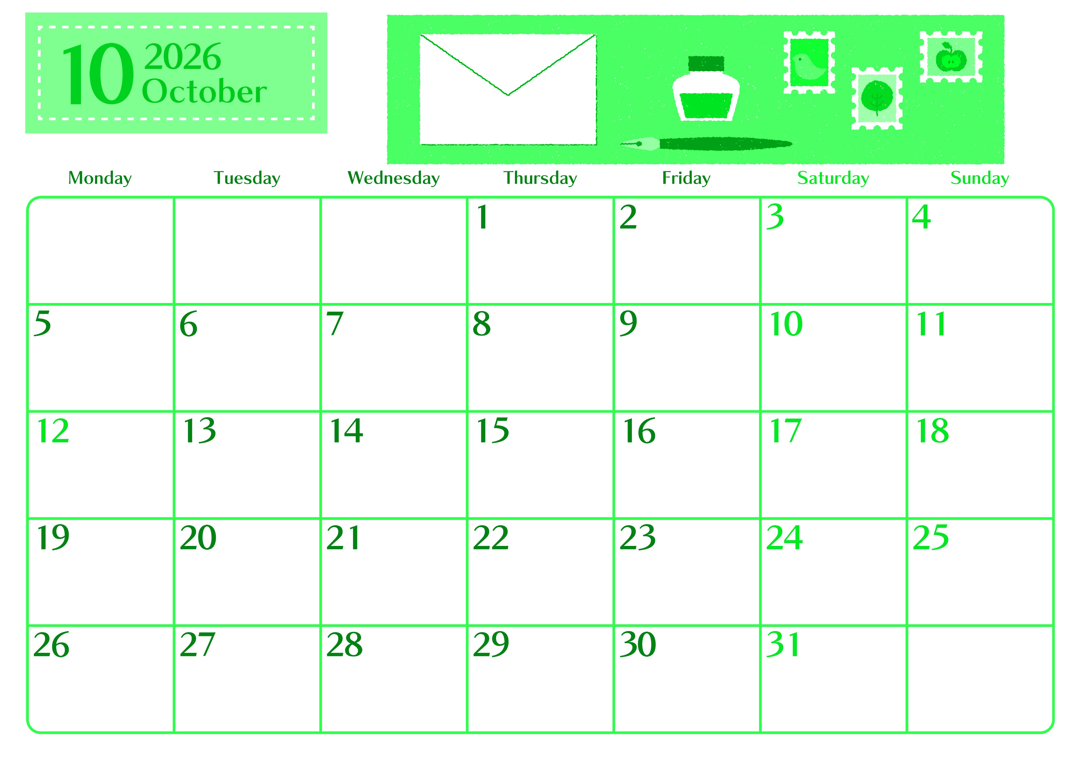 2026年10月横型月曜始まりの無料テンプレートグリーンのカレンダーです。文具好きな人におすすめをしたい手紙をはじめとしたイラストがおしゃれなグリーンのカレンダーです。月曜始まりなのでお仕事の予定もプライベートの予定も立てやすいです。(2026-00961001)