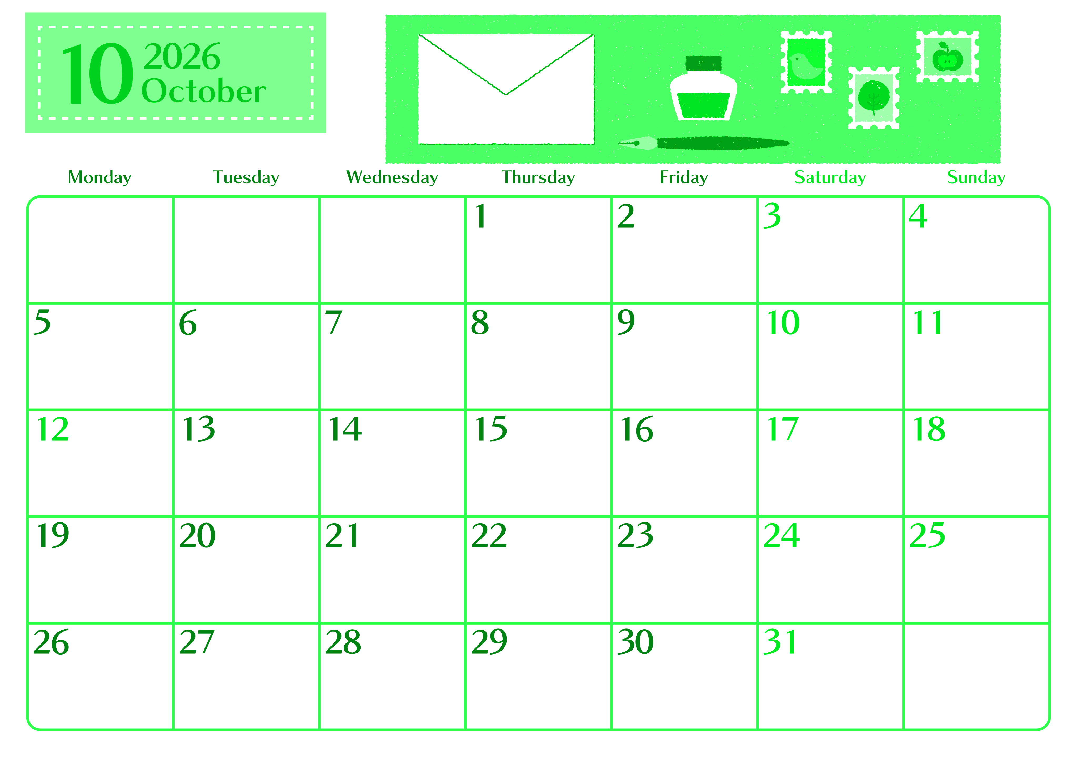 2026年10月横型月曜始まり 手紙イラストのおしゃれA4無料グリーンのカレンダー(2026-00961001)