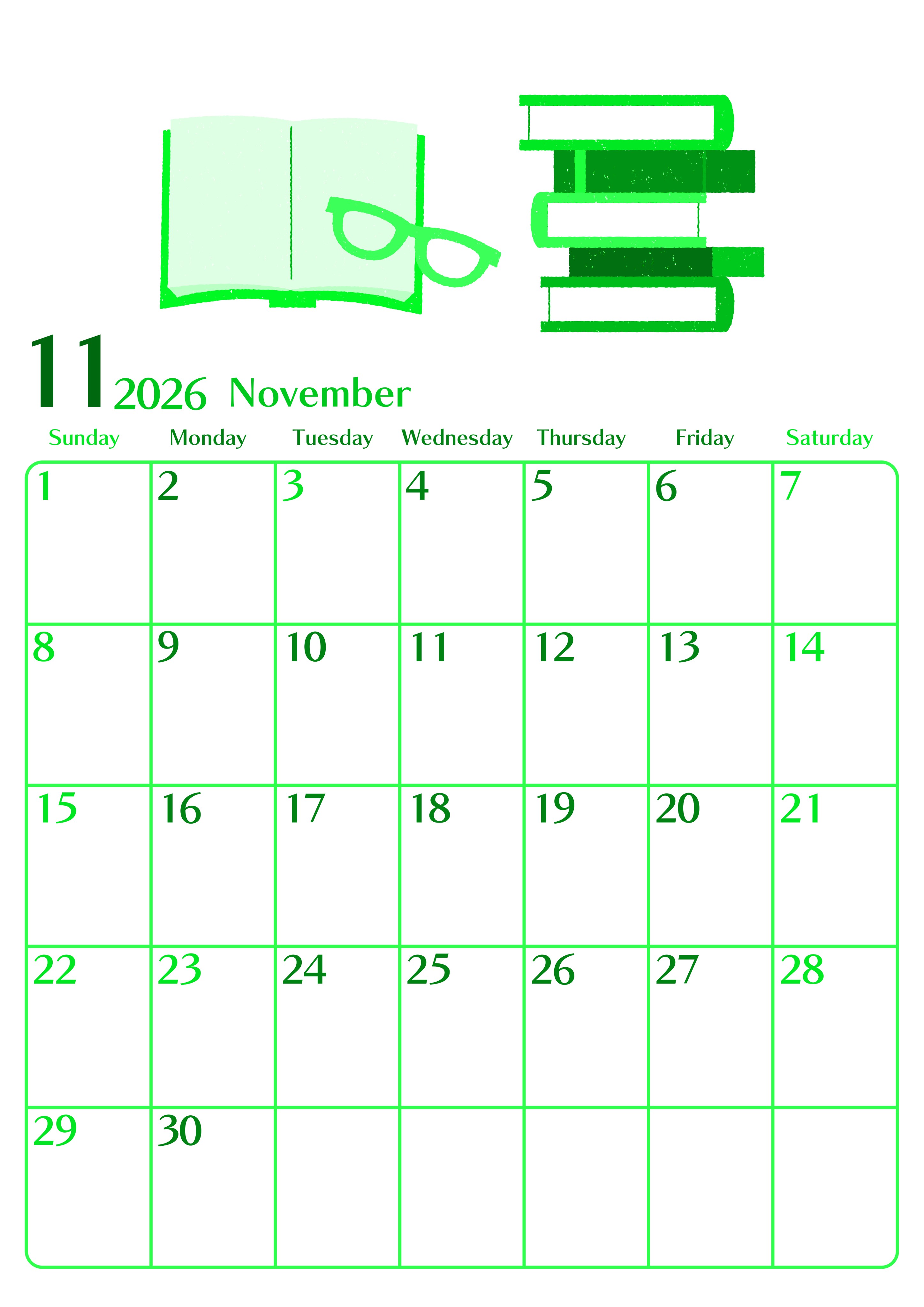 2026年11月縦型日曜始まり 読書イラストのおしゃれA4無料グリーンのカレンダー(2026-00961110)