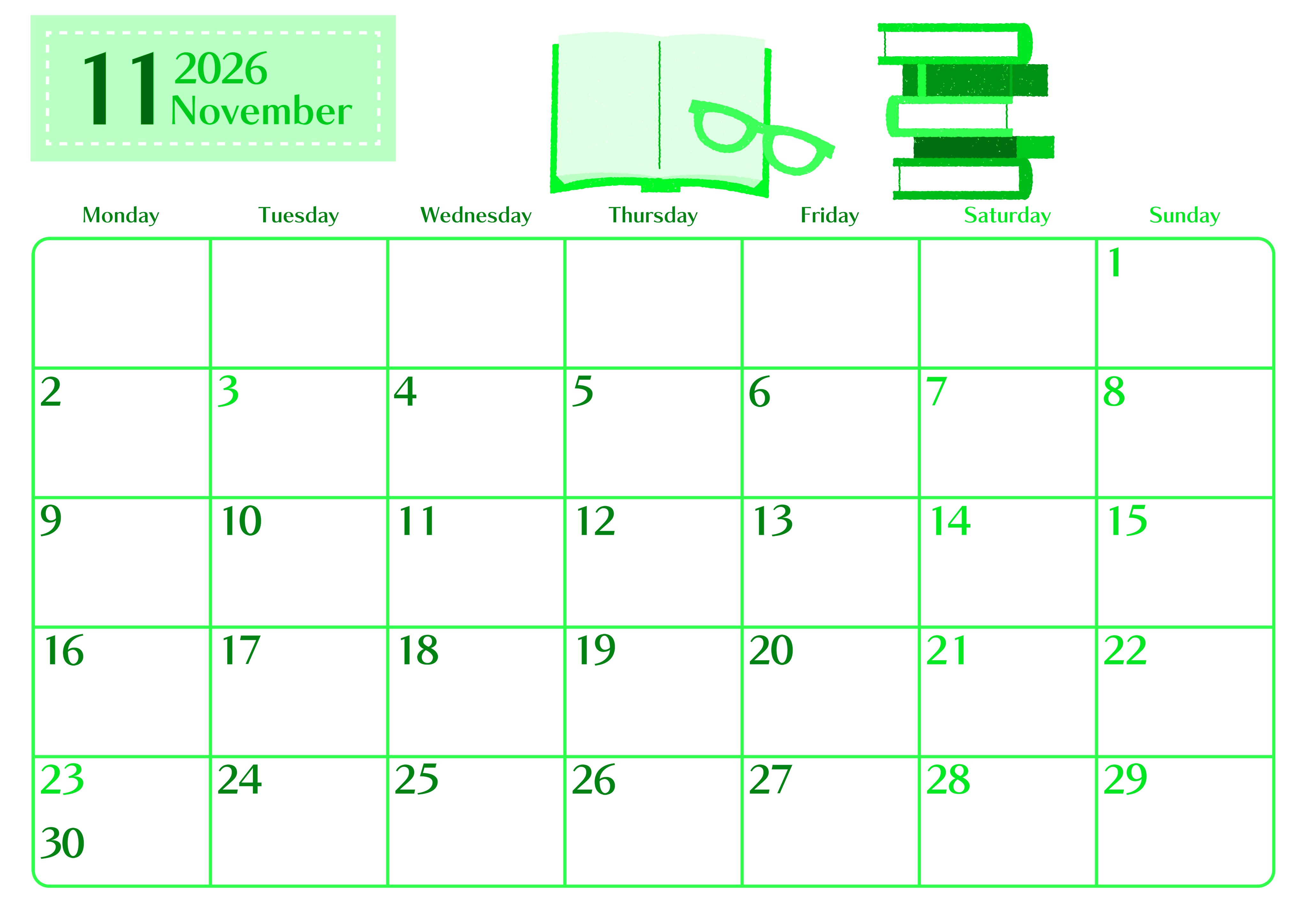 2026年11月横型月曜始まりの無料テンプレートグリーンのカレンダーです。読書を題材にした沢山の分厚い本とメガネをイラスト化したおしゃれな雰囲気をまとった月曜始まりの使いやすいグリーンのカレンダーとなっています。(2026-00961101)
