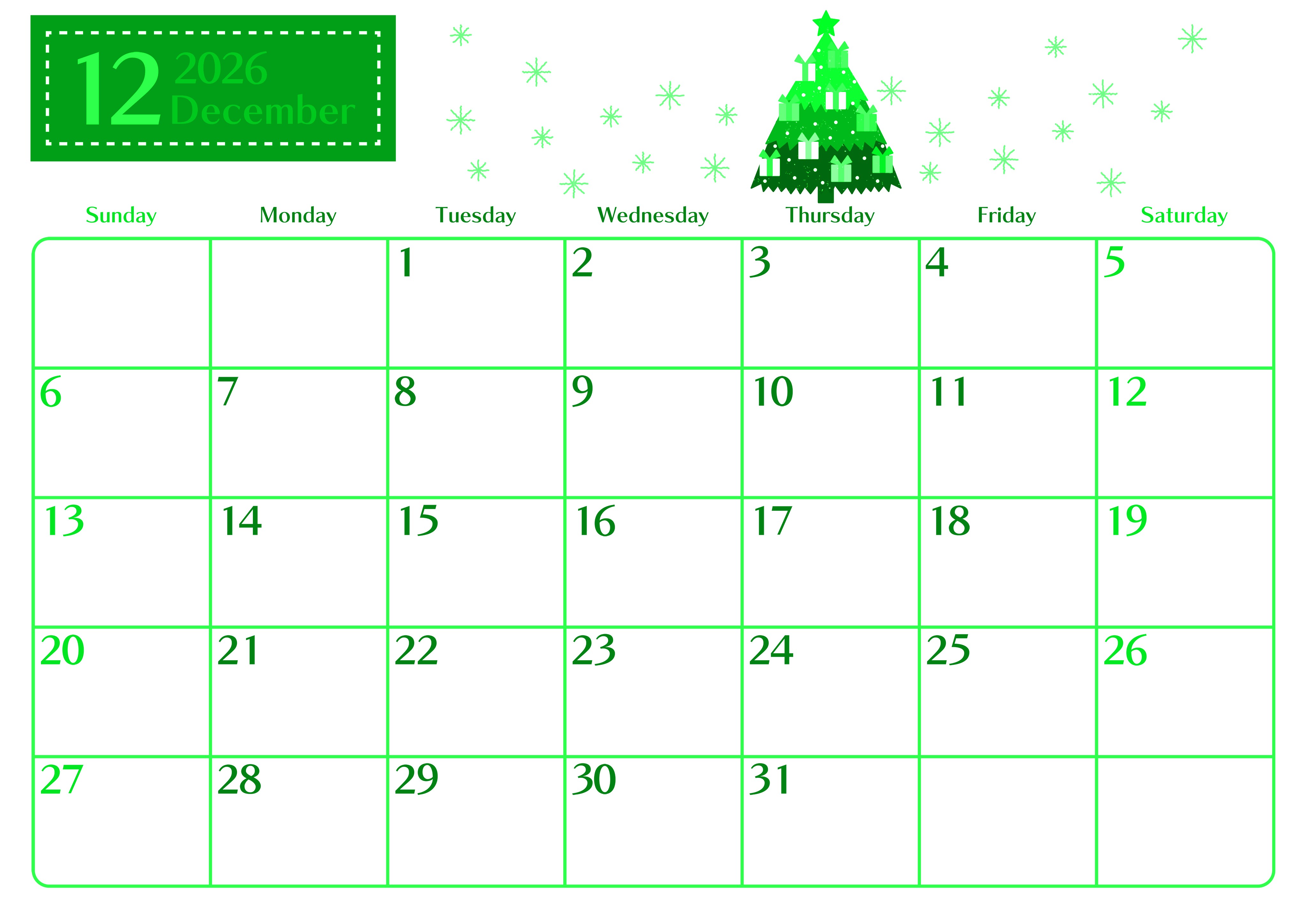 2026年12月横型日曜始まり クリスマスツリーイラストのおしゃれA4無料グリーンのカレンダー(2026-00961200)