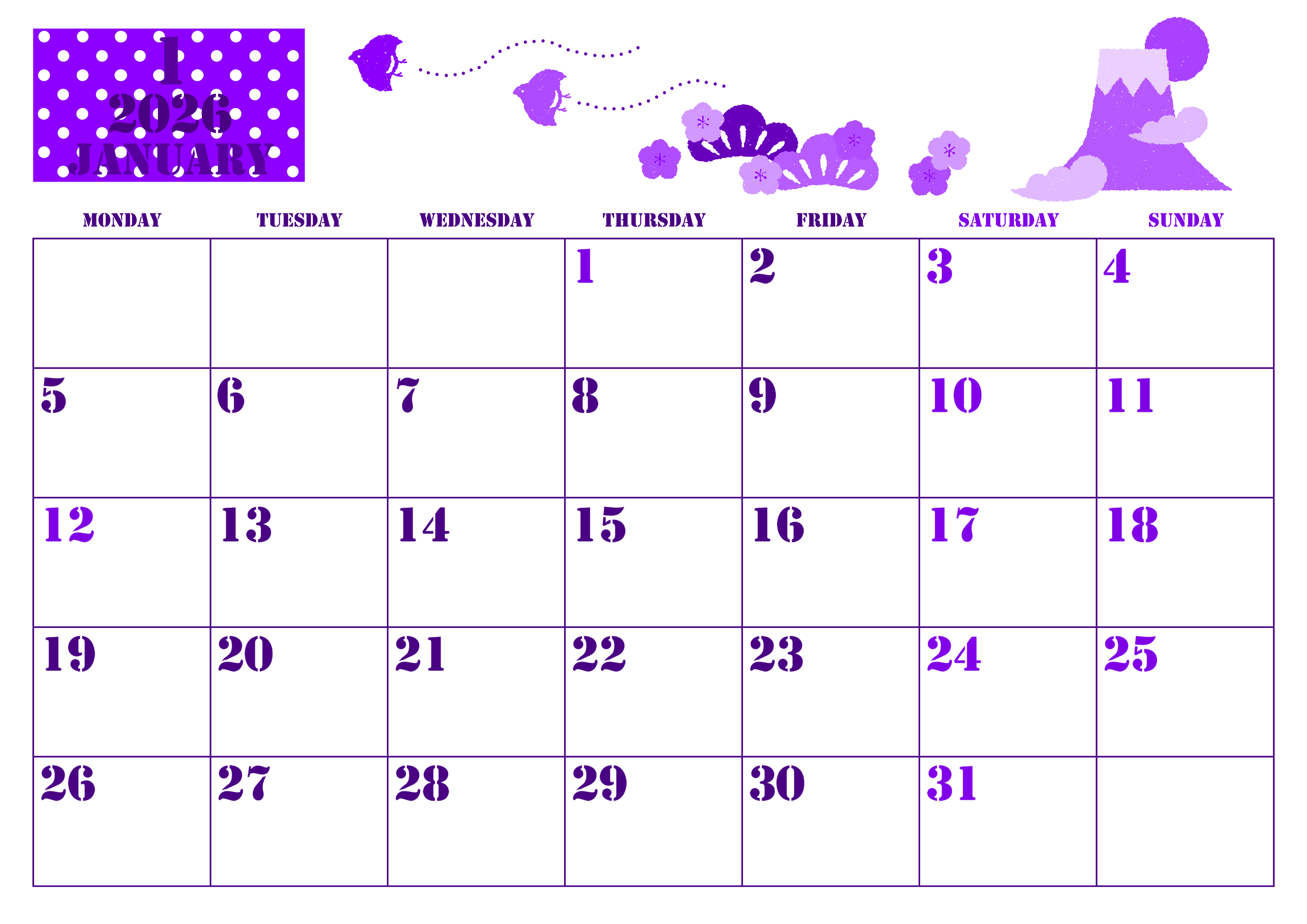 2026年1月横型月曜始まりパープルのカレンダーです。和風ともレトロともとれる色合いでデザインされたかわいいイラストが新年のおめでたい雰囲気を盛り上げてくれます。月曜始まりなのでお仕事のタスク管理をするのに特に向いている便利なパープルのカレンダーです。(2026-00970101)