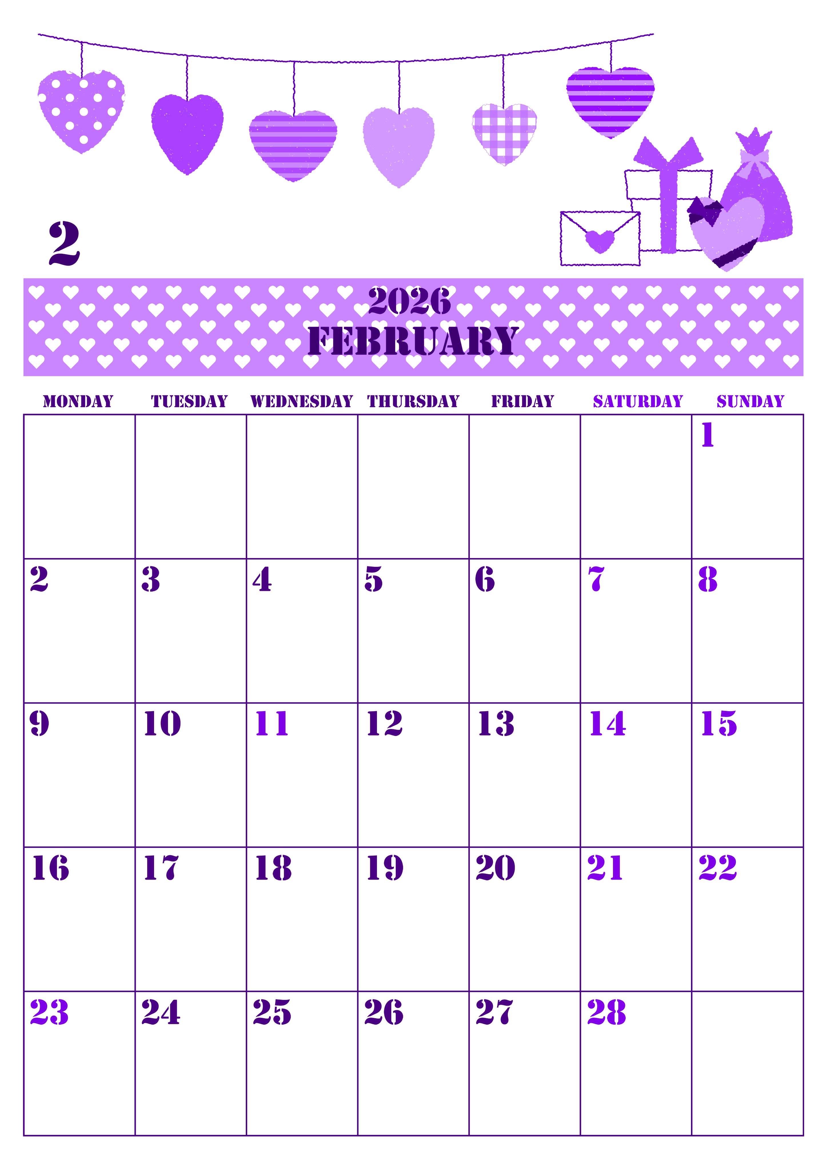 2026年2月縦型月曜始まりの無料テンプレートパープルのカレンダーです。月曜始まりなので家族の予定を立てるのにとても適しているフリー素材です。曜日によって文字の色分けがされているので読み違いを防げる縦型パープルのカレンダーでイラストもかわいいです。(2026-00970211)