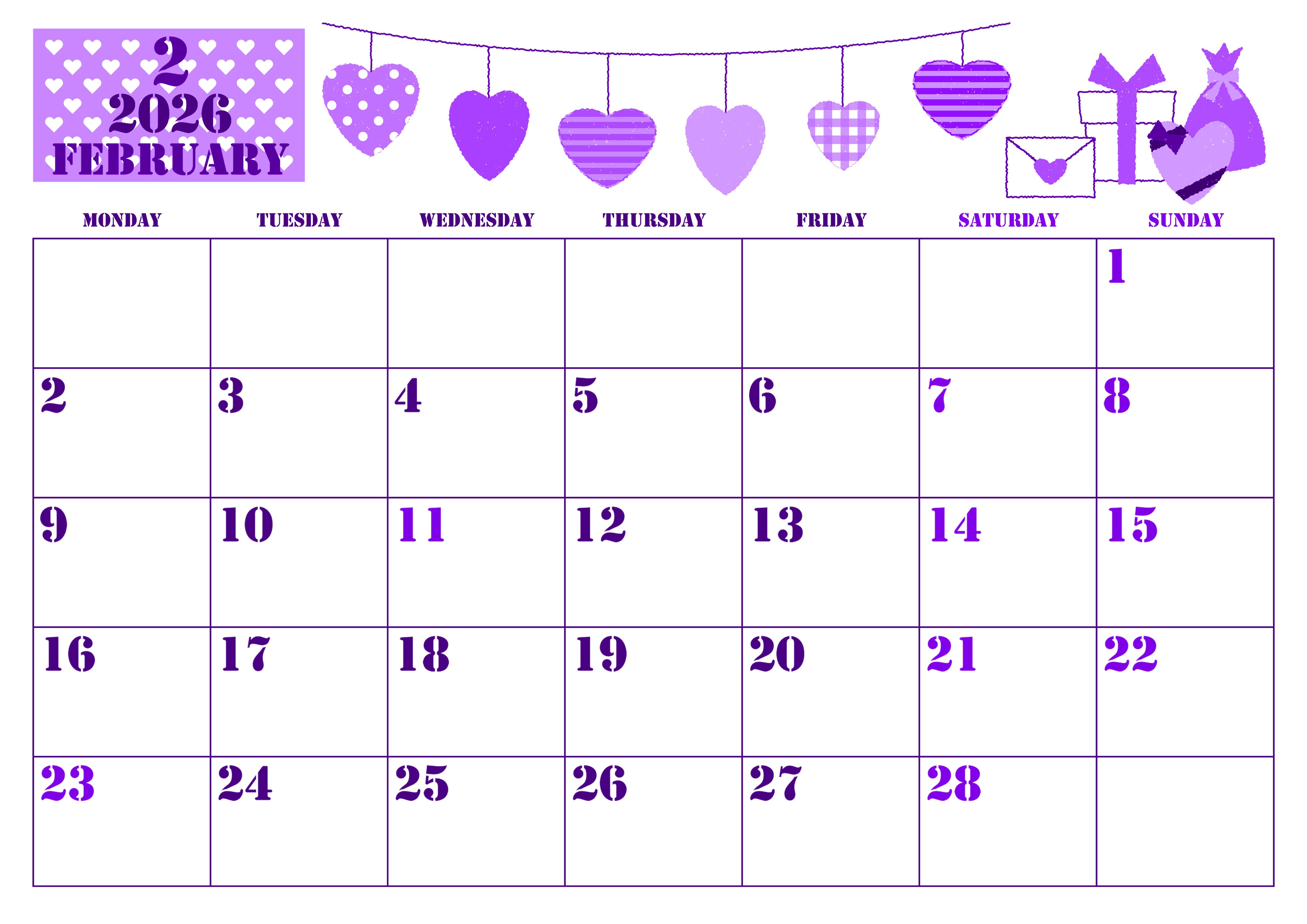 2026年・無料のカレンダーテンプレート 2026年2月横型月曜始まり ラブレターイラストのかわいいA4無料パープルのカレンダー(2026-00970201) 素材状デザイン王 2025年4月6日 2026年2月横型月曜始まりの無料テンプレートパープルのカレンダーです。シマシマ、水玉、チェックと様々なデザインのハートがかわいいタスク管理に使いやすい月曜始まりの無料パープルのカレンダーです。(2026-00970201) 2月 横型のカレンダー 月曜始まり パープル カレンダーデザイン-0097