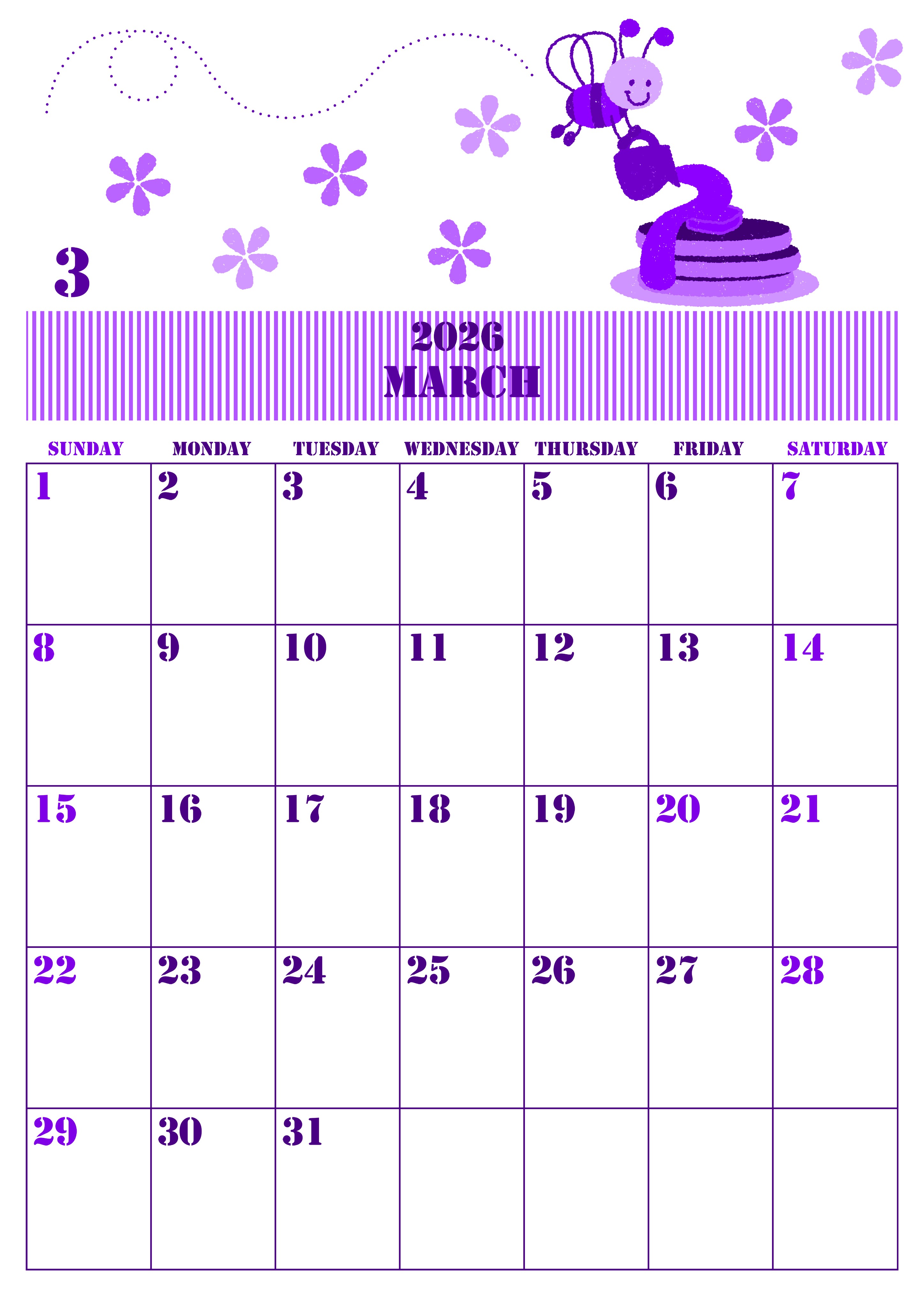 2026年3月縦型日曜始まりの無料テンプレートパープルのカレンダーです。ミツバチとパンケーキのコンビネーションがかわいい雰囲気を醸し出しているパープルのカレンダーテンプレートです。(2026-00970310)
