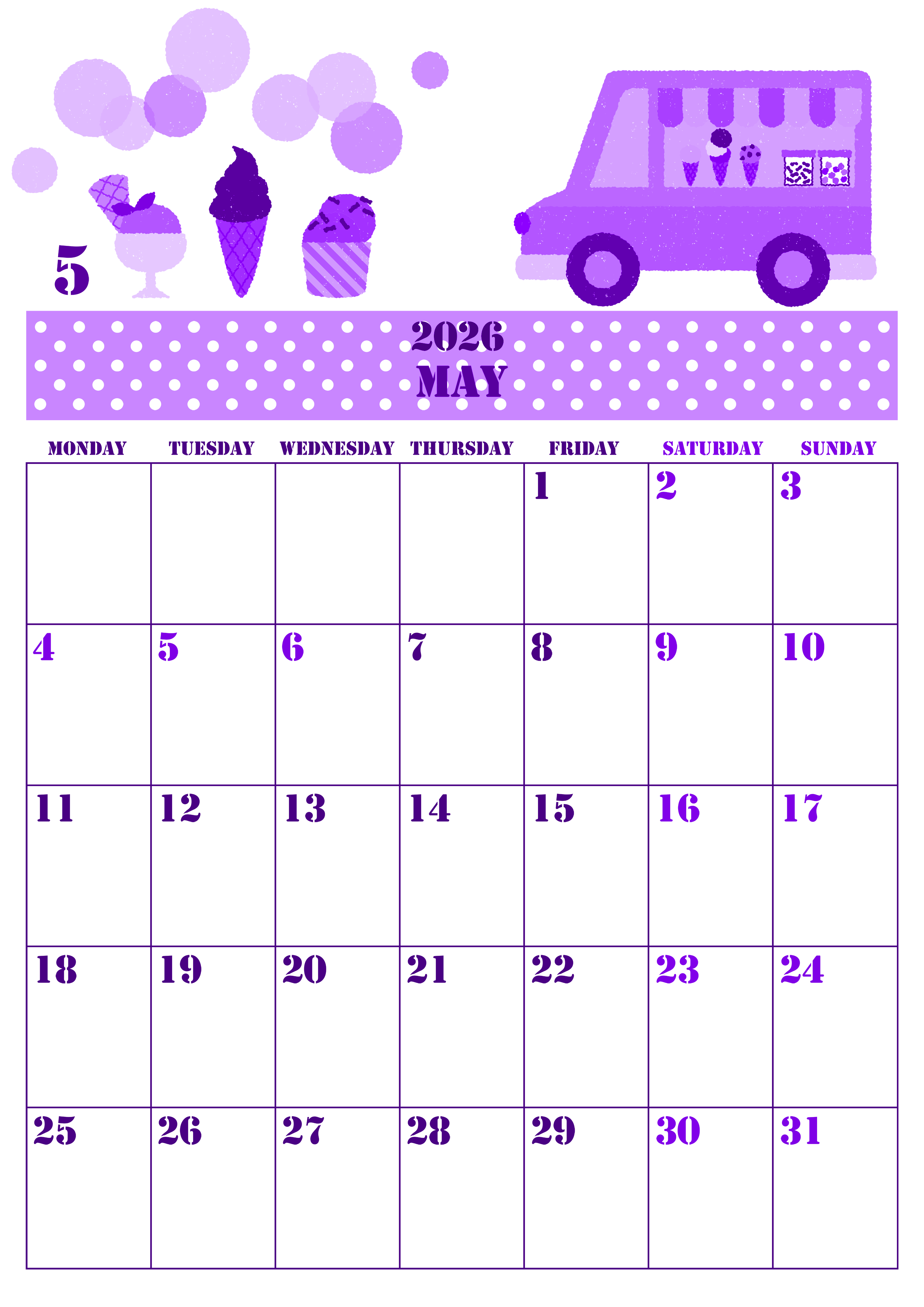 2026年5月縦型月曜始まりの無料テンプレートパープルのカレンダーです。アイスクリームやソフトクリームとスイーツが充実しているかわいいイラストが目を引く月曜始まりの無料パープルのカレンダーとなっています。(2026-00970511)