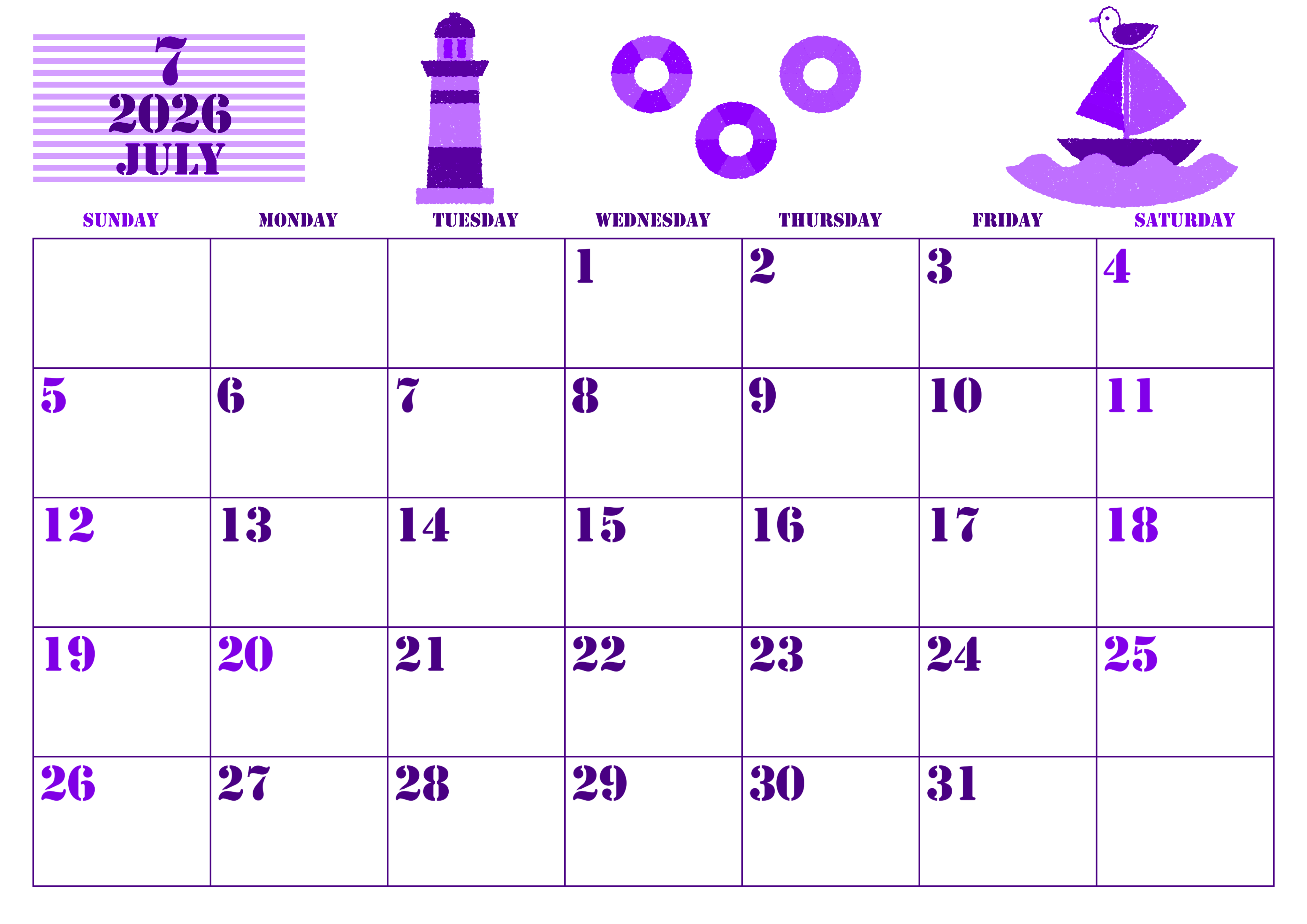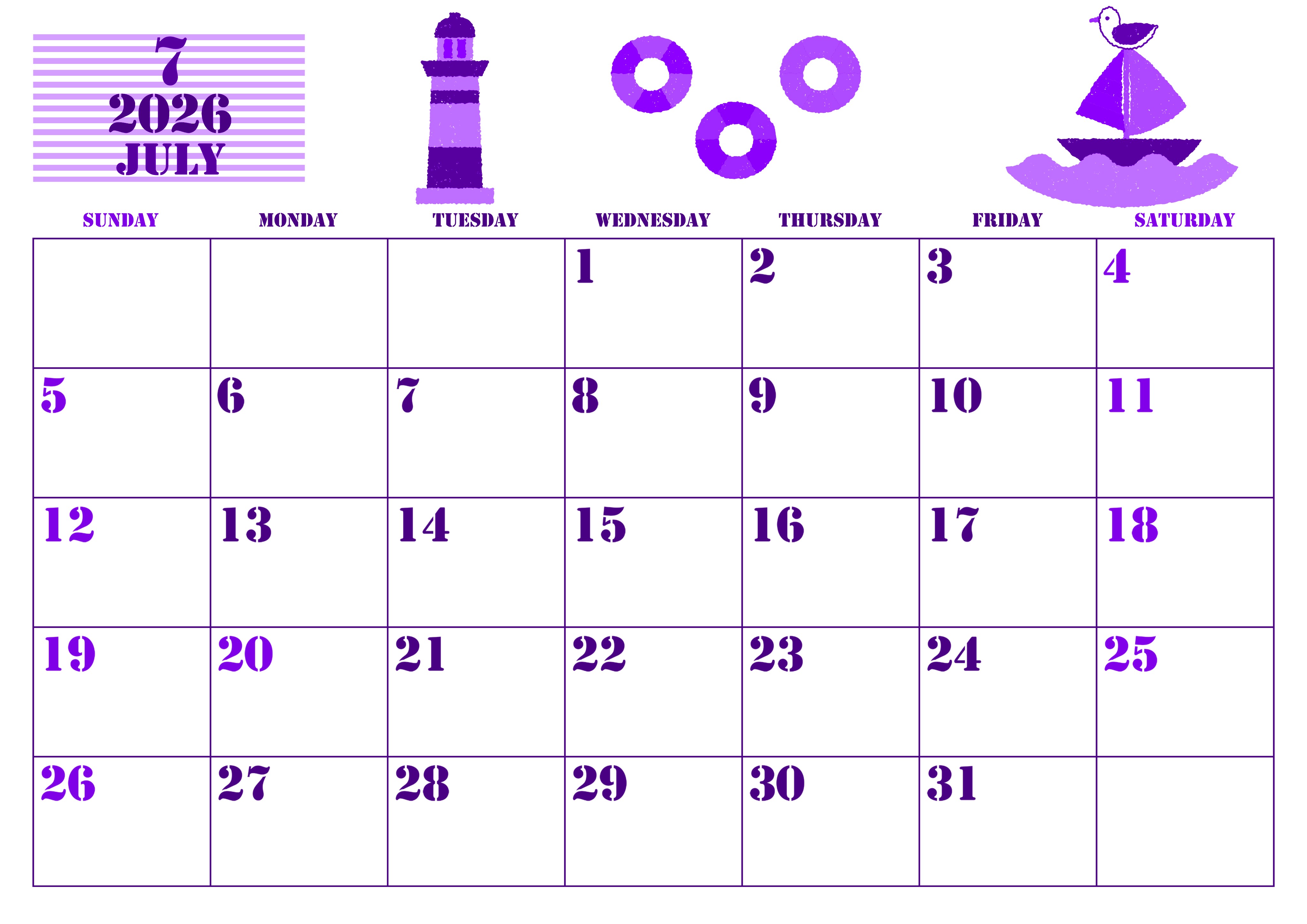 2026年7月横型日曜始まりの無料テンプレートパープルのカレンダーです。灯台や浮き輪といったマリンテイストのポップでかわいいイラストに元気づけられるような魅力的なイラストが添えられているパープルのカレンダーとなっています。(2026-00970700)