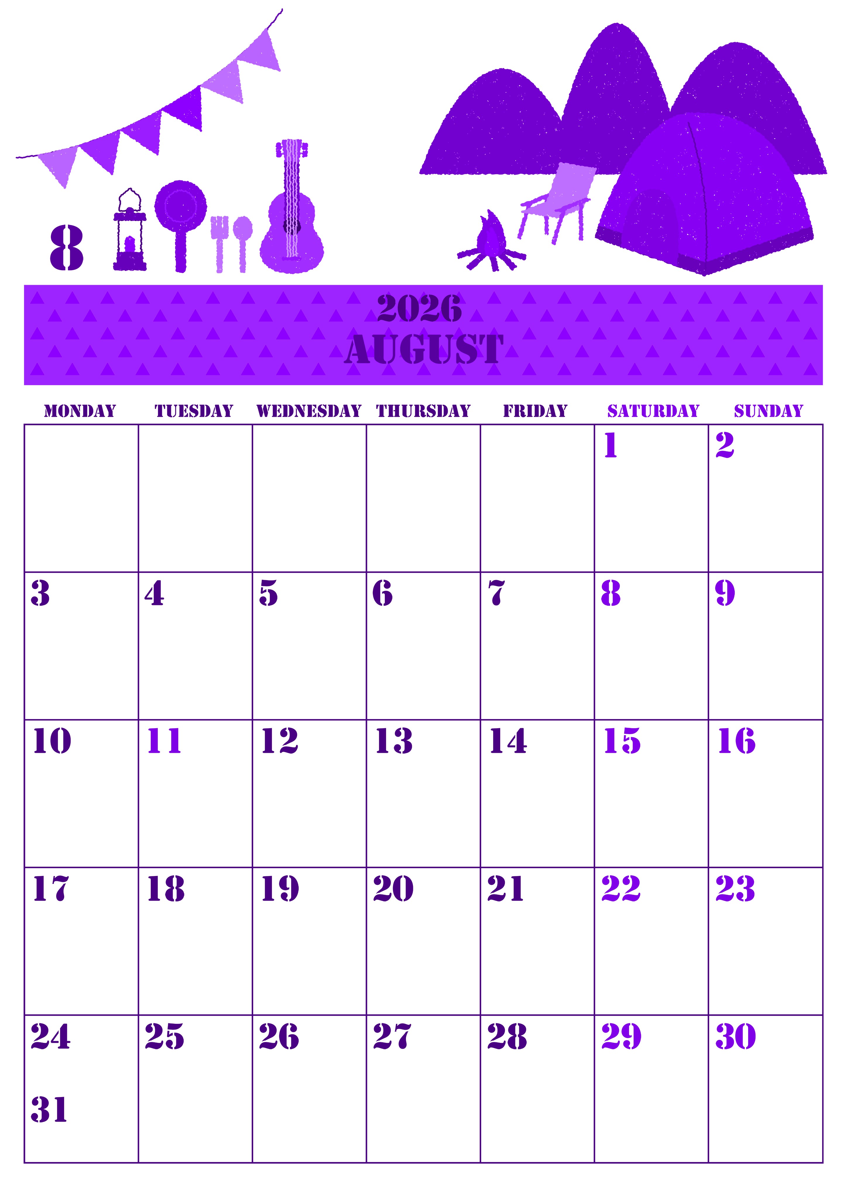 2026年8月縦型月曜始まりの無料テンプレートパープルのカレンダーです。夏休みにキャンプで楽しんでいるシーンを取り上げたかわいいポップで鮮やかな月曜始まりのイラストパープルのカレンダーとなっています。(2026-00970811)