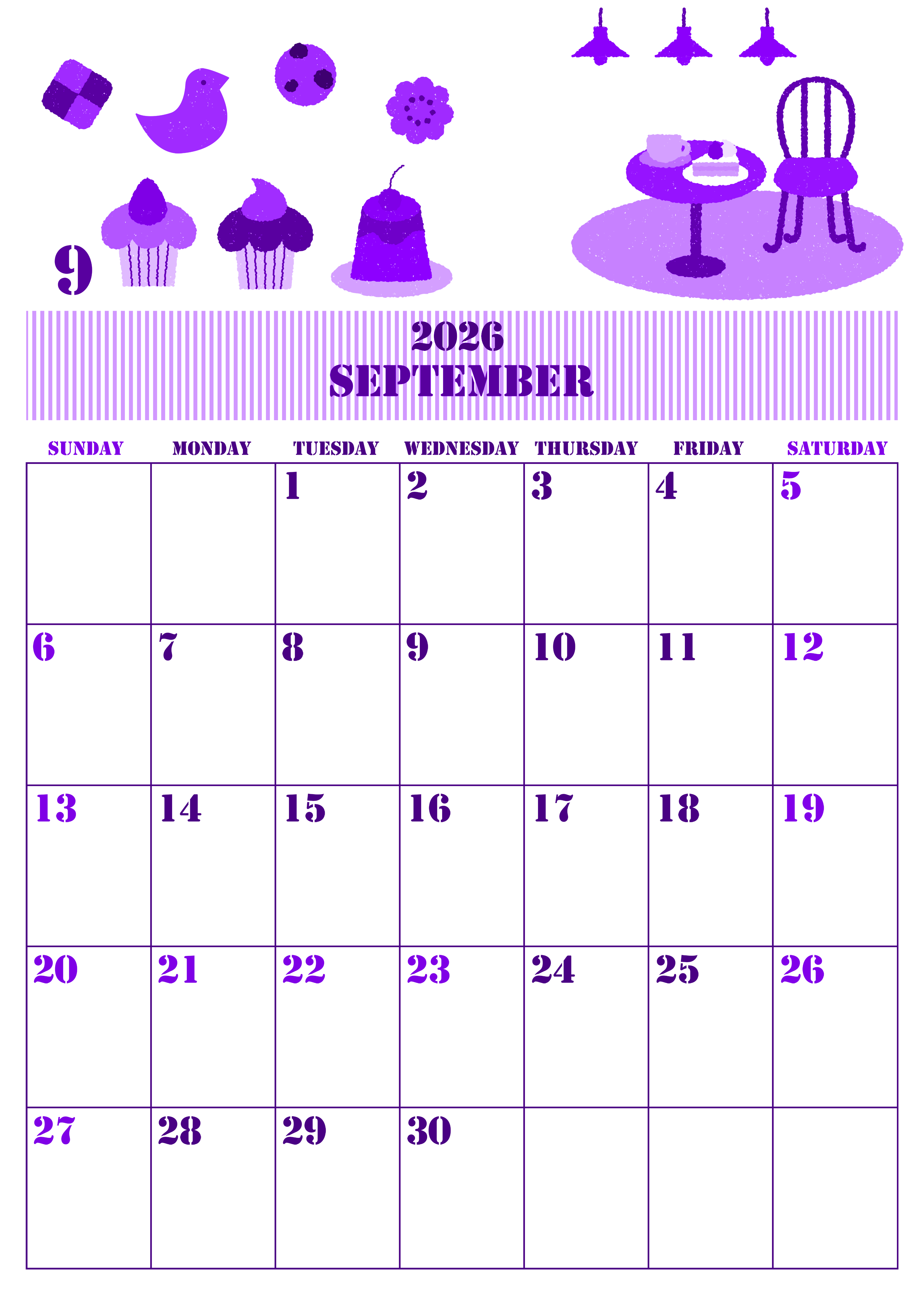 2026年9月縦型日曜始まりの無料テンプレートパープルのカレンダーです。食欲の秋をモチーフにしたかわいいカフェテイストなイラストパープルのカレンダーです。縦向きなので壁に貼って使うのにぴったりな無料で使えるコンテンツです。(2026-00970910)