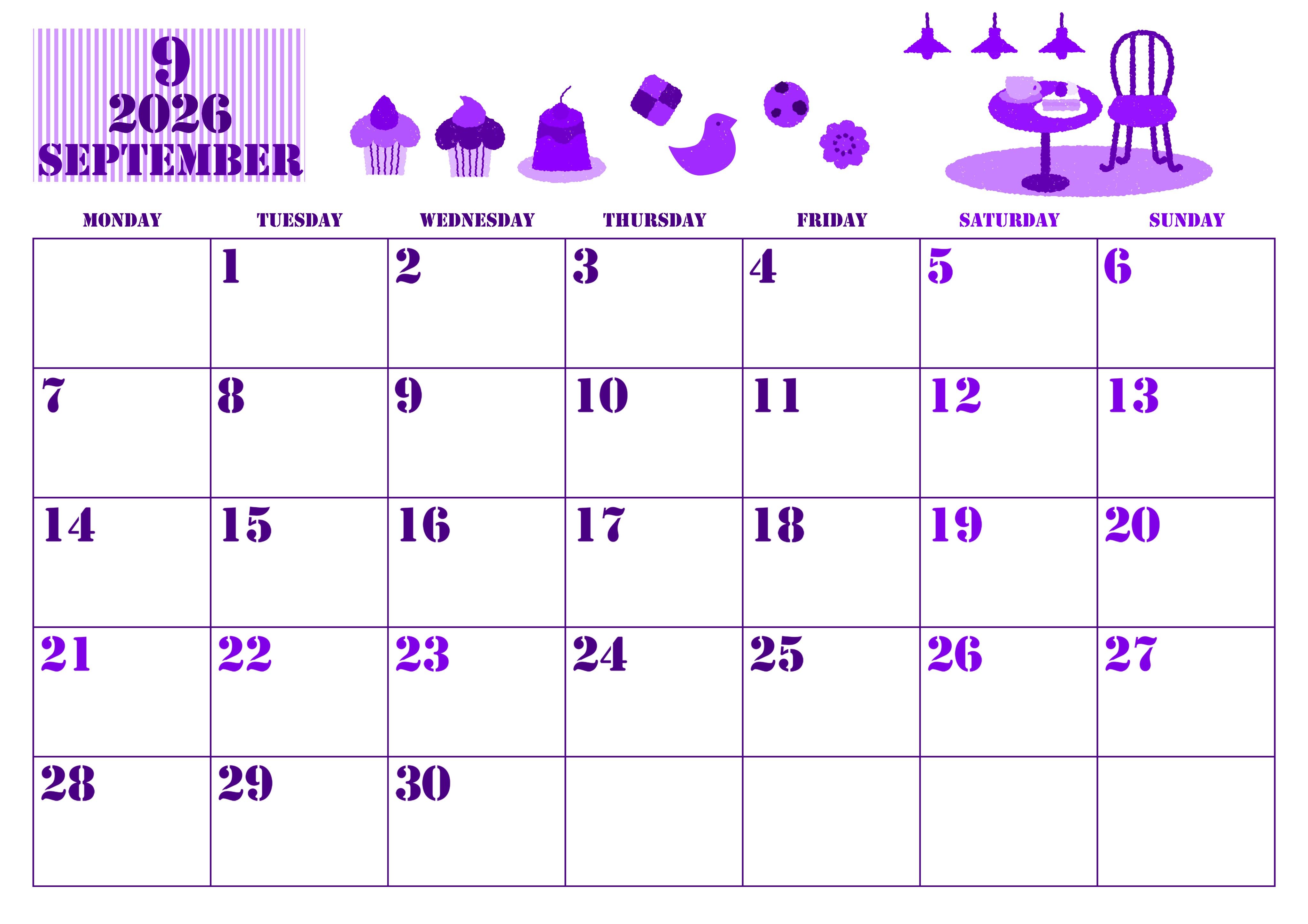 2026年9月横型月曜始まりの無料テンプレートパープルのカレンダーです。月曜始まりのレイアウトがパープルのカレンダーは使いやすいと思っている人に無料でダウンロードをしてほしいフリー素材です。イラストは食欲の秋をテーマにしていてかわいいです。(2026-00970901)