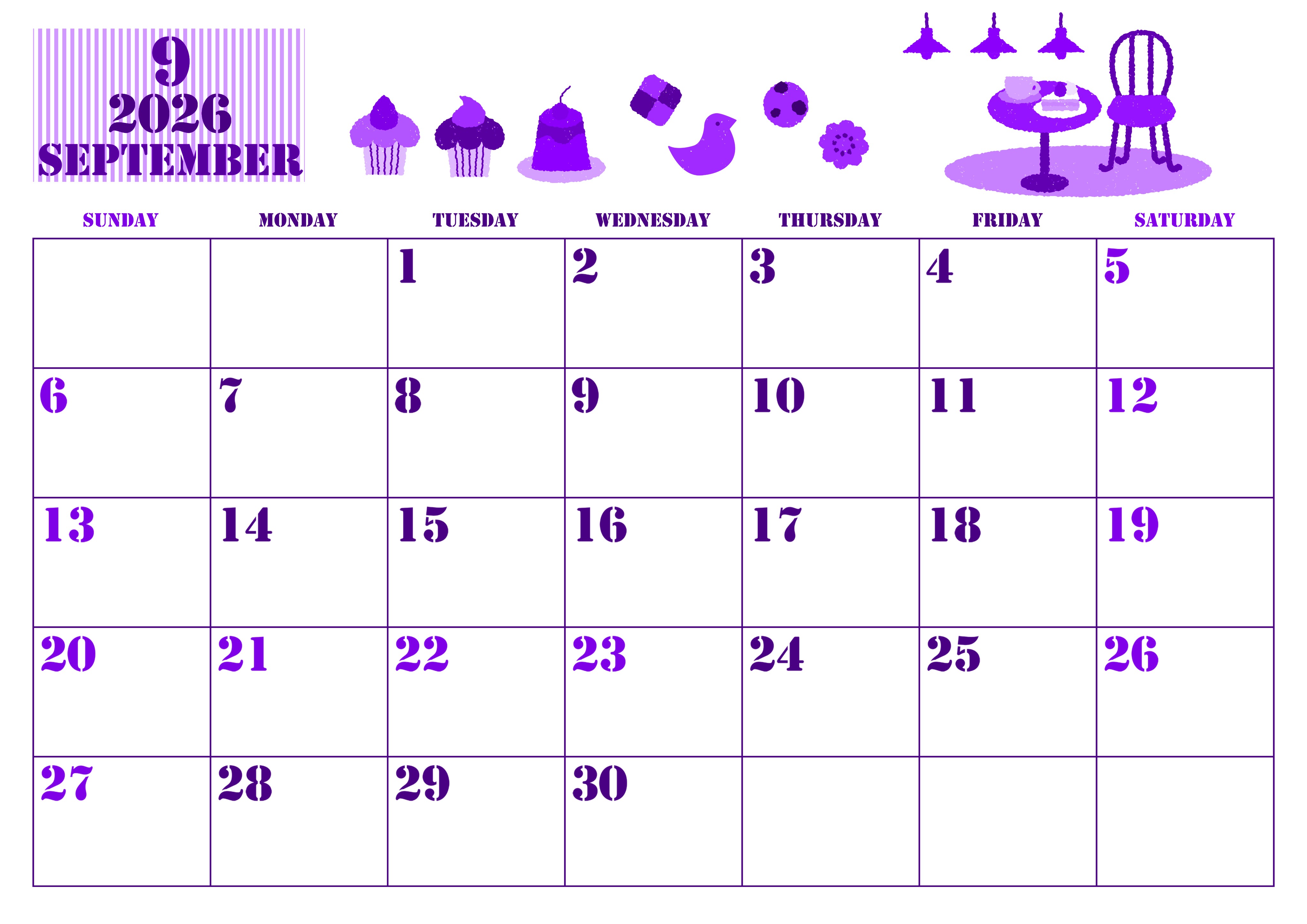 2026年9月横型日曜始まりの無料テンプレートパープルのカレンダーです。食欲の秋を連想させるようなスイーツやカフェをテーマとしたイラストがガーリーでかわいい使いやすいパープルのカレンダーを用意しました。(2026-00970900)