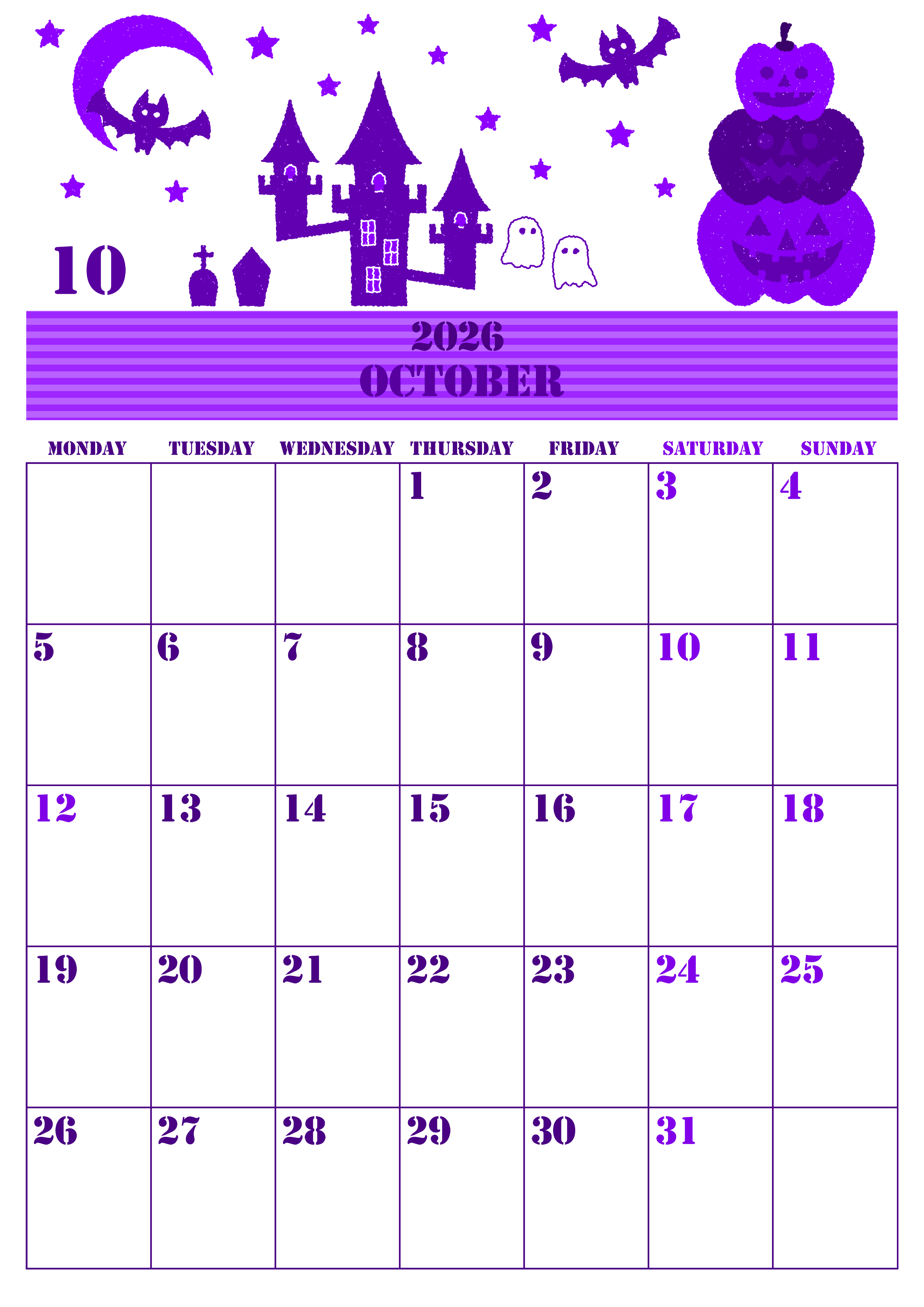 2026年10月縦型月曜始まり ハロウィンイラストがかわいいA4無料パープルのカレンダー(2026-00971011)