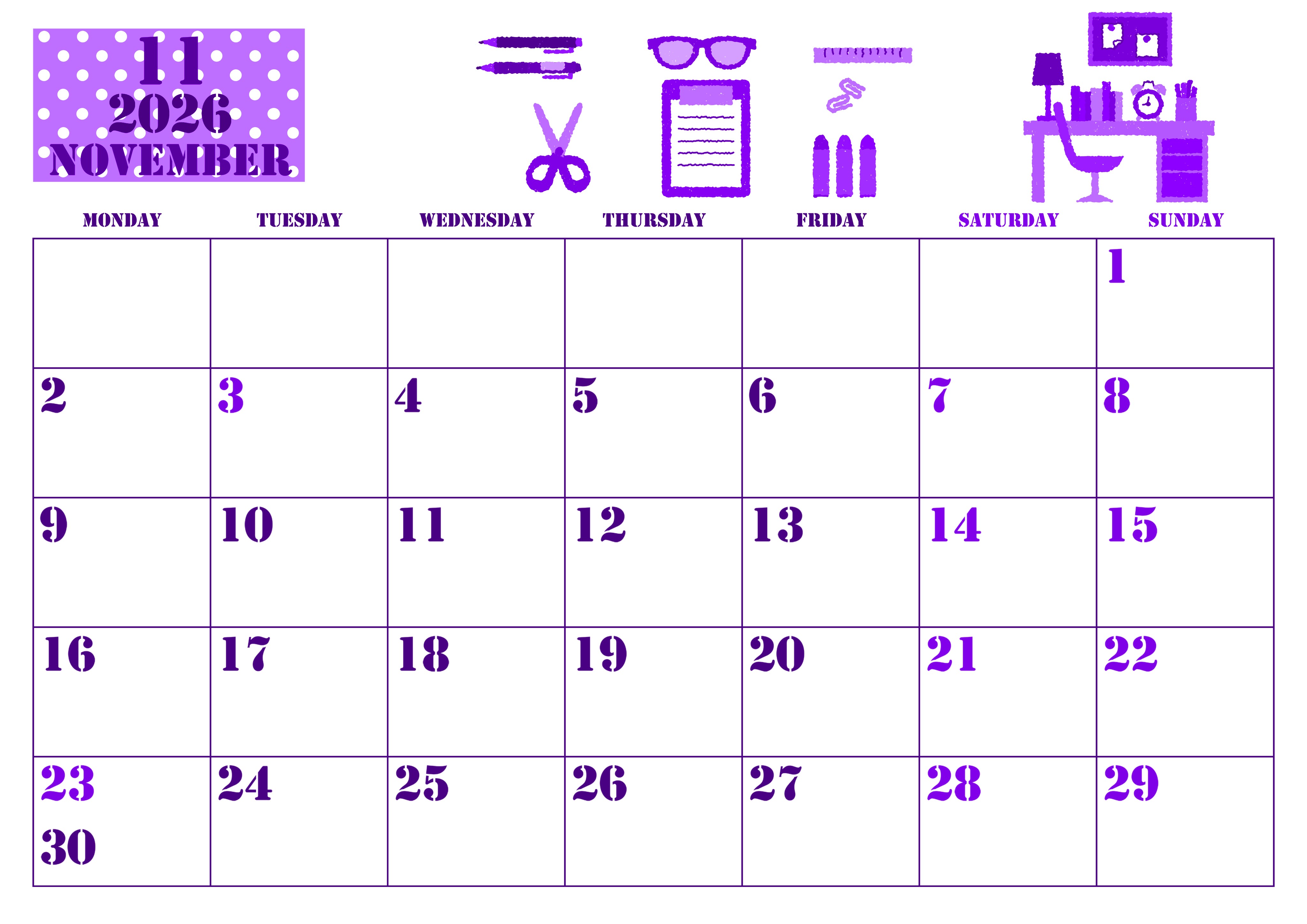 2026年11月横型月曜始まりの無料テンプレートパープルのカレンダーです。文房具にこだわりを持っているという人におすすめしたいイラストがかわいいパープルのカレンダー部分も罫線がはっきりしていて実用的な月曜始まり素材です。(2026-00971101)