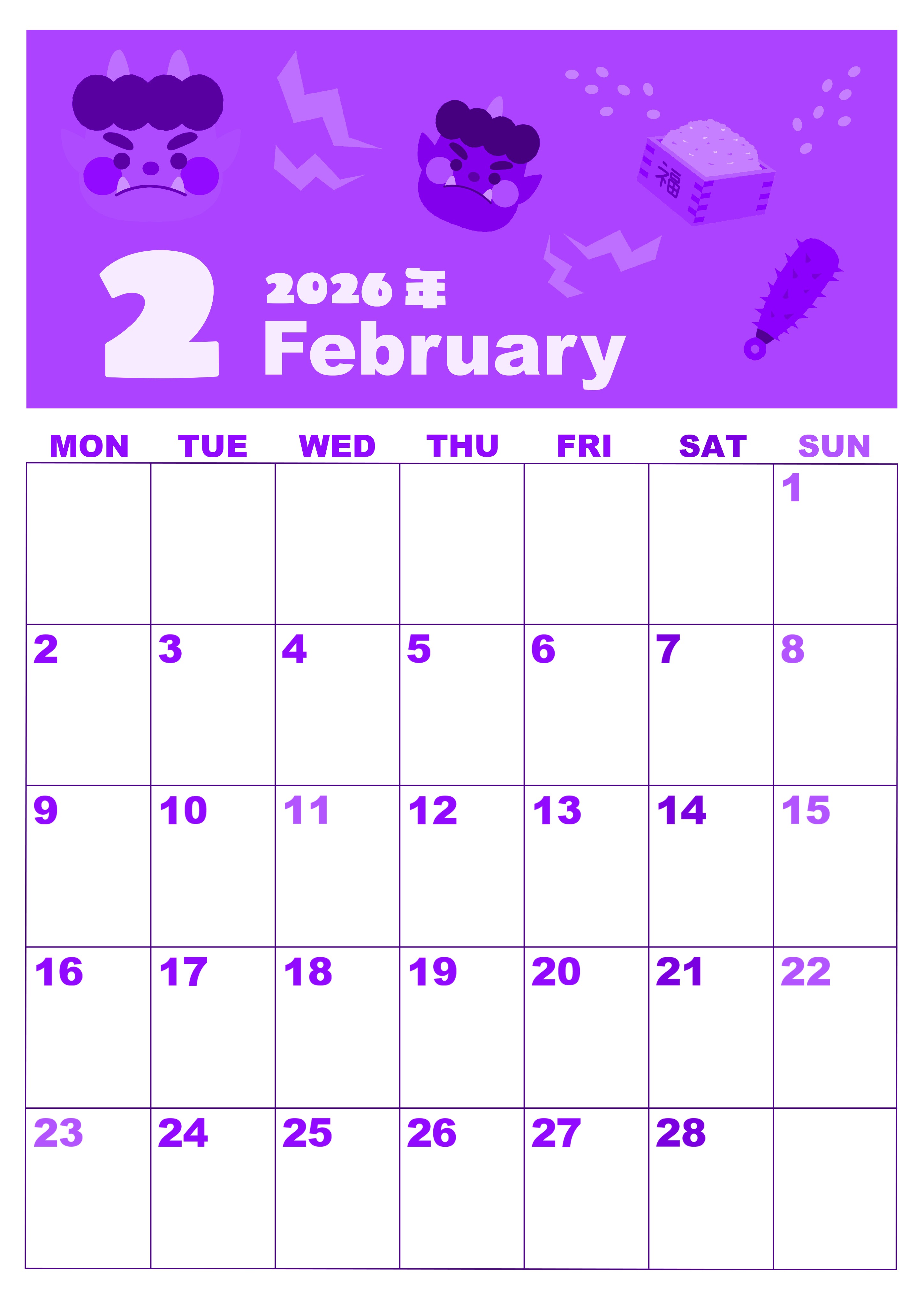 2026年2月縦型月曜始まりの無料テンプレートパープルのカレンダーです。月曜始まりのパープルのカレンダーが使いやすいという人にとって最適な素材なのでダウンロードをおすすめします。イラストは赤鬼と青鬼と金棒でかわいいです。(2026-00980211)