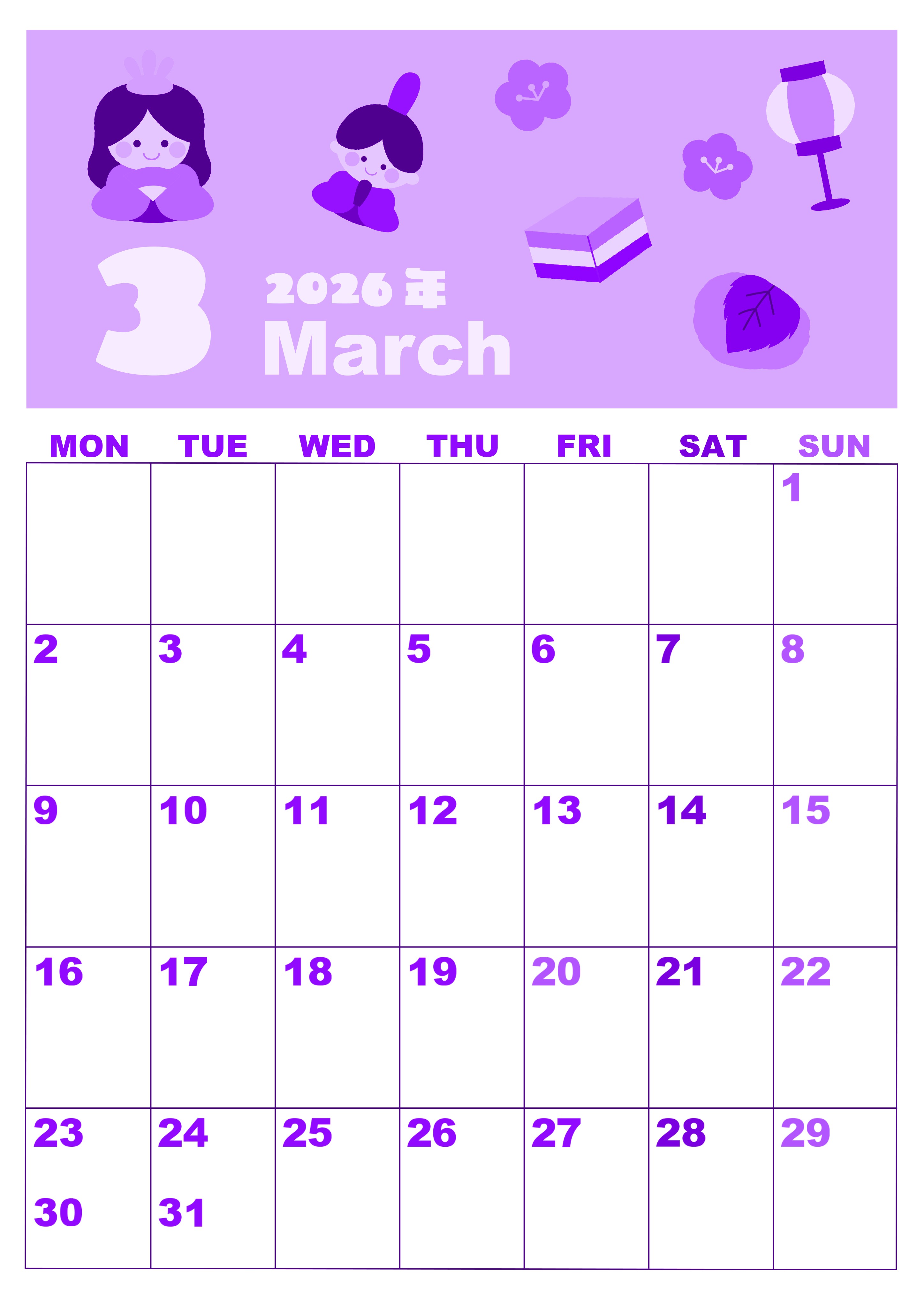 2026年・無料のカレンダーテンプレート 2026年3月縦型月曜始まり ぼんぼりイラストのかわいいA4無料パープルのカレンダー(2026-00980311) 素材状デザイン王 2025年4月6日 2026年3月縦型月曜始まりの無料テンプレートパープルのカレンダーです。女の子らしいかわいい世界観満載のイラストフリー素材です。パープルのカレンダーは月曜始まりに慣れてるという方にピッタリです。(2026-00980311) 3月 縦型のカレンダー 月曜始まり パープル カレンダーデザイン-0098