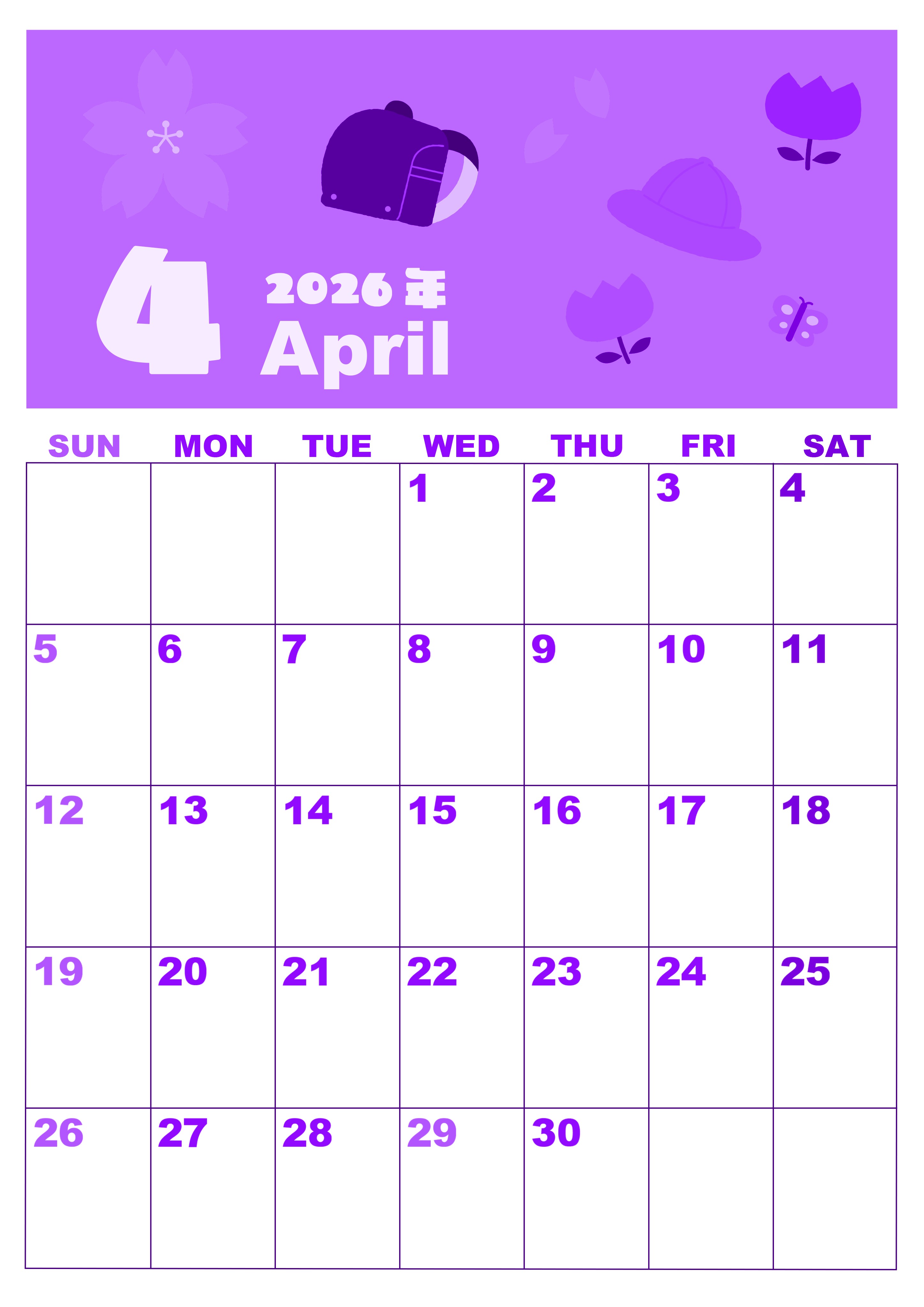 2026年4月縦型日曜始まりの無料テンプレートパープルのカレンダーです。元気な子供たちを連想させるようなかわいいランドセルのイラストが付いたパープルのカレンダーです。家族でのスケジュール把握に適しているフリー素材です。(2026-00980410)