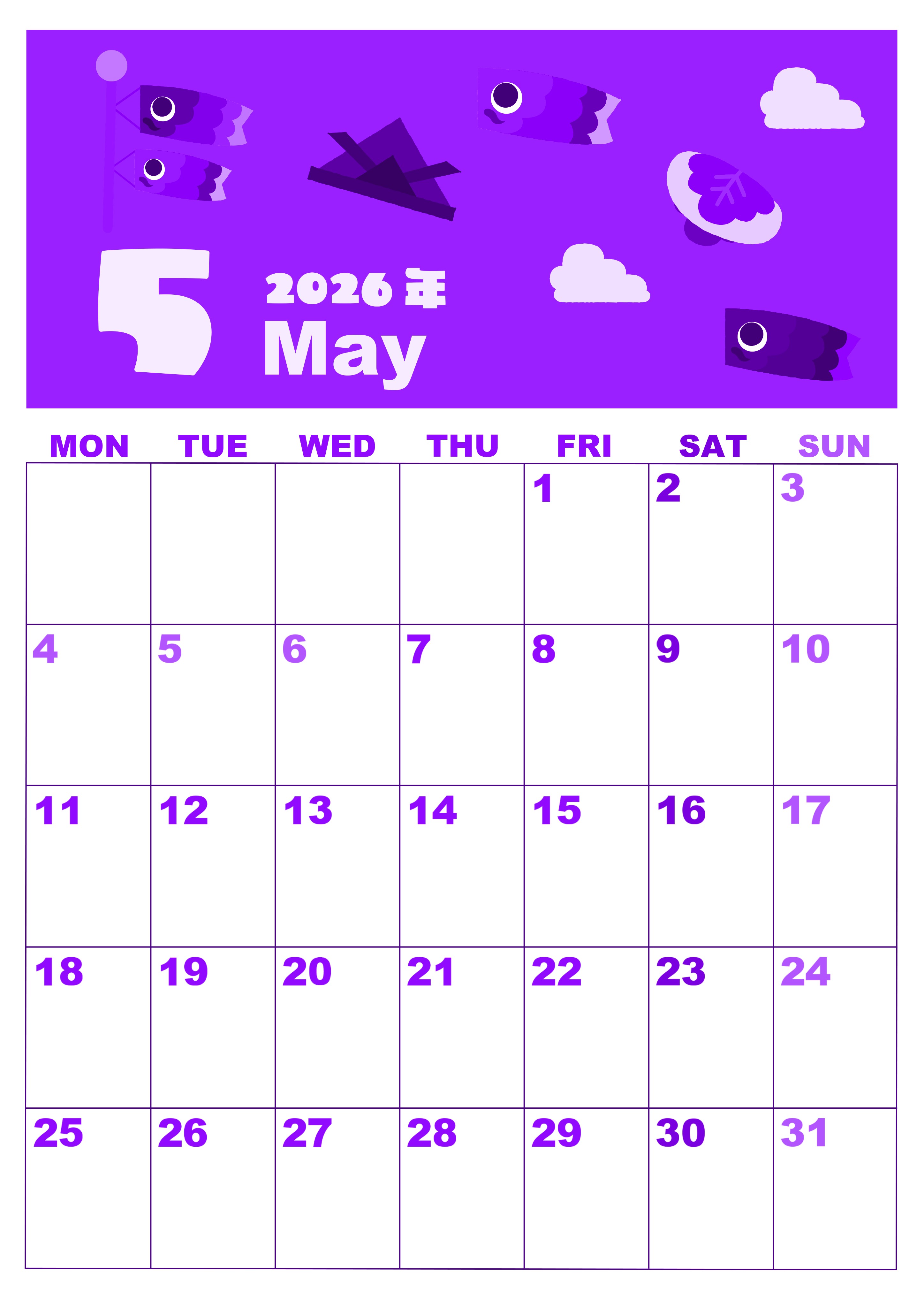 2026年5月縦型月曜始まりの無料テンプレートパープルのカレンダーです。月曜始まりのパープルのカレンダーに慣れている人におすすめの無料コンテンツです。子供の日をはじめとする行事を連想させるポップでかわいいイラスト付きです。(2026-00980511)