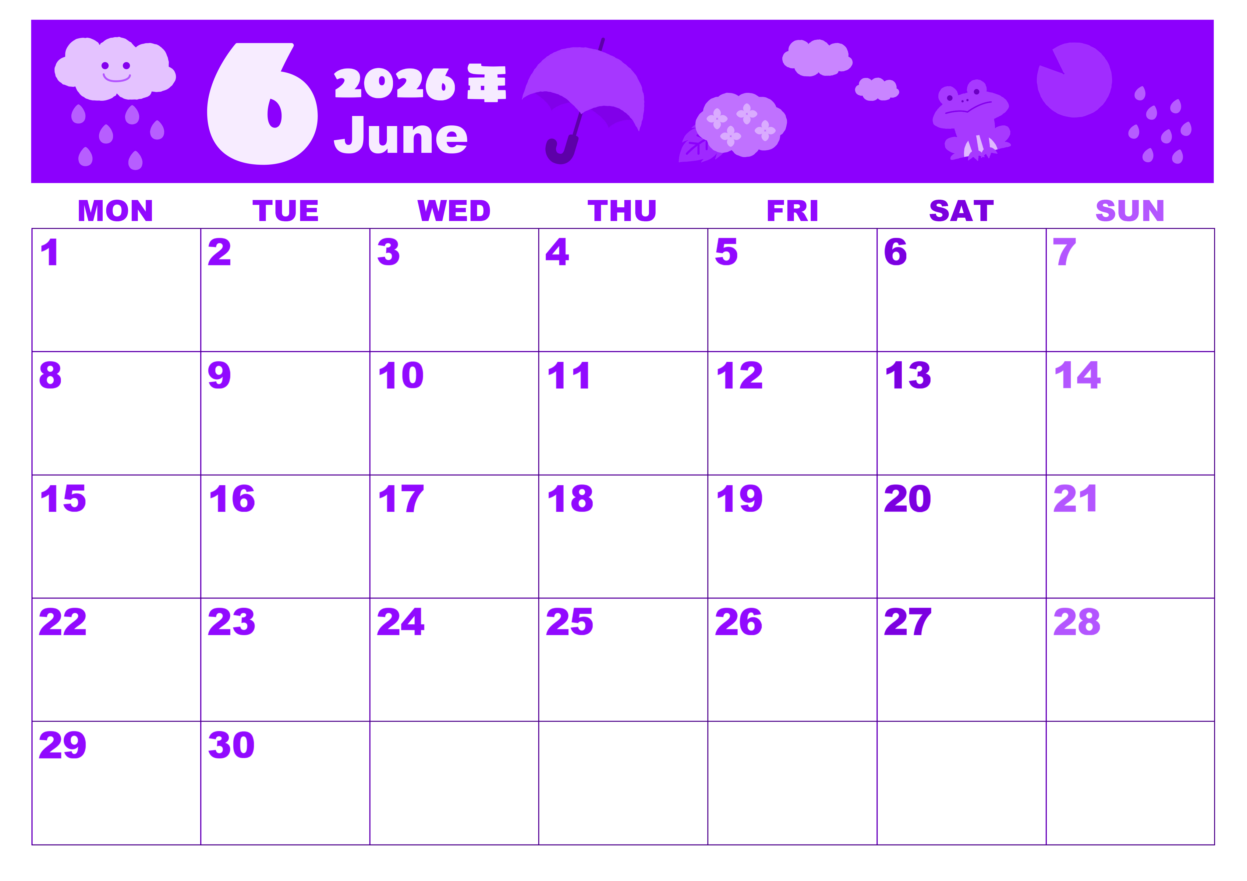 2026年6月横型月曜始まりの無料テンプレートパープルのカレンダーです。太文字の6月が白抜きされていて周りのイラストも梅雨を思わせるかわいいイラストです。月曜始まりタイプのパープルのカレンダーに慣れ親しんでいる人にダウンロードをおすすめします。(2026-00980601)