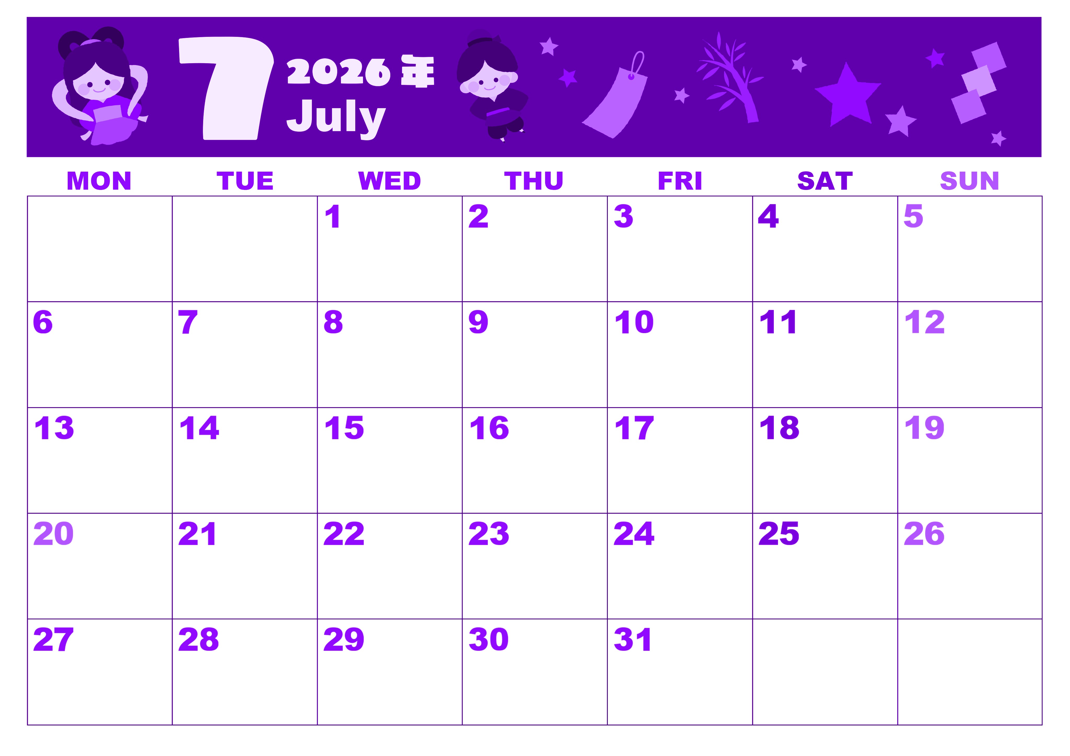 2026年7月横型月曜始まりの無料テンプレートパープルのカレンダーです。月曜始まりかつA4用紙に印刷をするだけですぐに使えるパープルのカレンダーです。織姫と彦星がふわふわと浮かんでいる様子がかわいいイラスト付きです。(2026-00980701)
